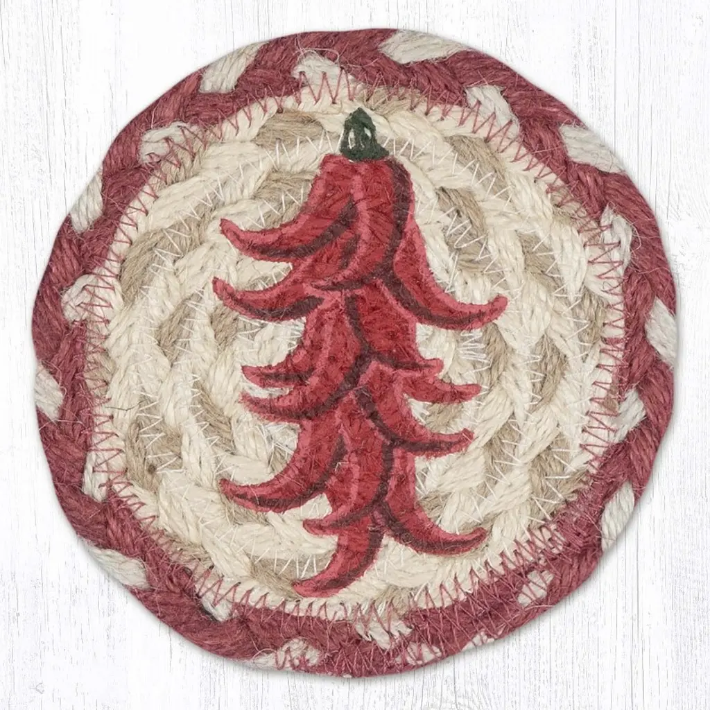 Bring a touch of spice to your home with the Earth Rugs Single Chili Pepper Round Large Coaster. Featuring a striking chili pepper design, this rustic piece brings warmth, bold color, and Southwestern flair to your decor. Key Features: Protect surfaces with a durable oversized 7-inch round coasterFeatures a bold single chili pepper design for a Southwestern lookAdds rustic farmhouse charm to kitchens, dining rooms, and lodgesEco-friendly braided jute construction for strength and styleLarge size easily fits mugs, glasses, and small bowlsLow-maintenance with easy spot-clean care