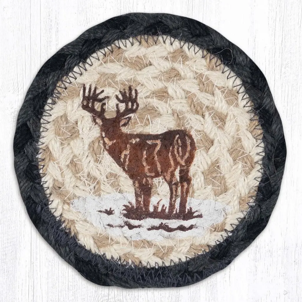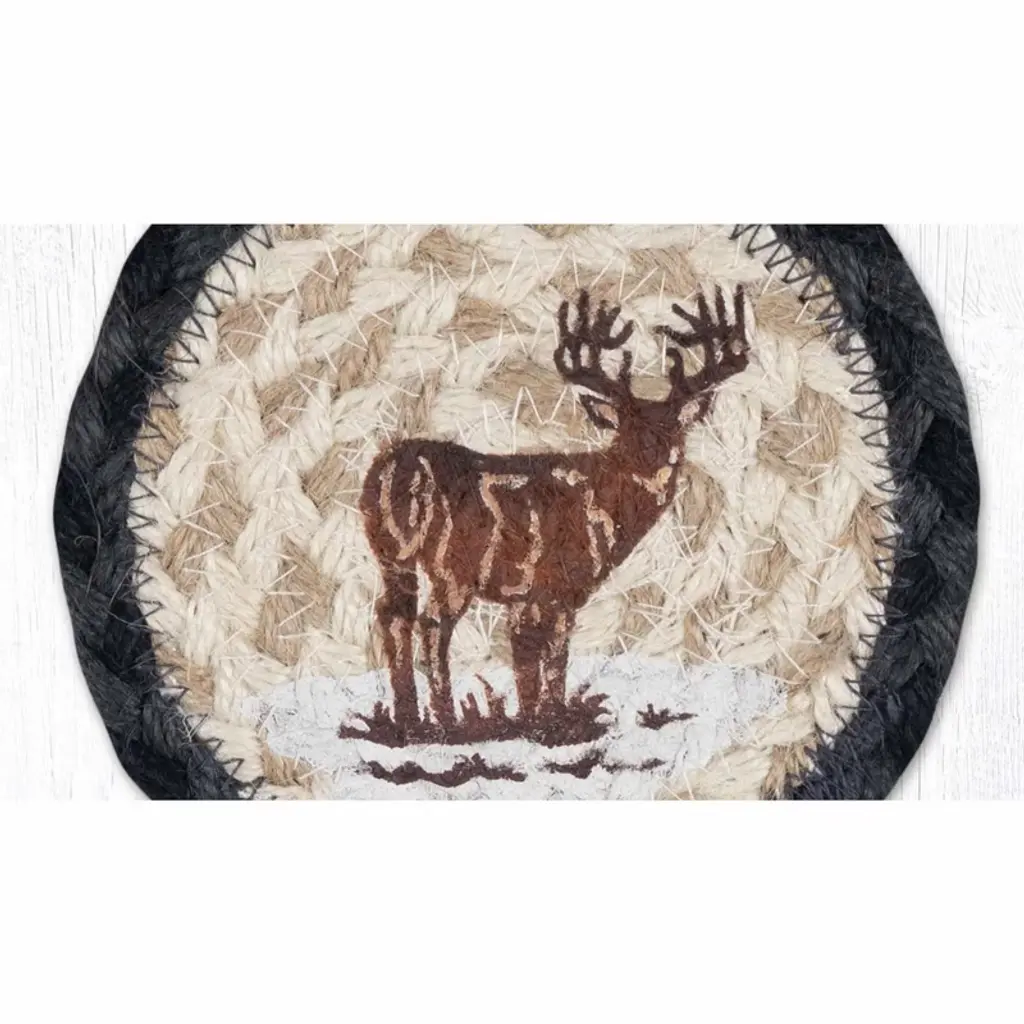 Earth Rugs Stag Printed Coaster – 5"x5" Round Braided Jute Coaster With Deer Design