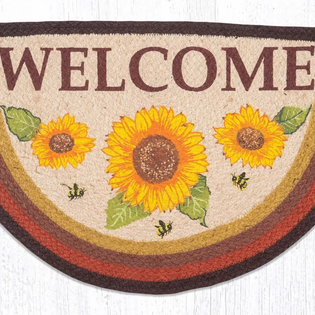 Earth Rugs Sunflower Welcome Entry Tread Rug – Hand-Stenciled Braided Jute Slice, 18"x29" Brighten your entryway with the cheerful charm of the SCP-606 Jute Slice Rug, featuring a hand-stenciled sunflower and “Welcome” design by artist Harry W. Smith. Measuring 18 inches high by 29 inches wide, this semi-circular rug is crafted from durable, sustainable natural jute, offering both textural interest and lasting quality. The vibrant sunflower motif, paired with a warm welcome message, creates a sunny and inviting first impression. Its slice shape fits neatly along baseboards or thresholds, making it ideal for farmhouse, cottage, or country-style interiors. A perfect decorative accent for any season, especially spring and summer. Key Features : Welcoming Message: Features hand-stenciled “Welcome” with a sunflower motif to greet guests warmlyPerfectly Sized: Compact 18"H × 29"W design fits in front of doors, kitchen sinks, or porchesOne-of-a-Kind Appeal: Hand-applied stencil ensures each rug has a unique artisan finishEco-Conscious Design: Made from natural jute for a sustainable, textured aestheticFlexible Placement: Semi-circle shape hugs entryways, maximizing space without sacrificing style