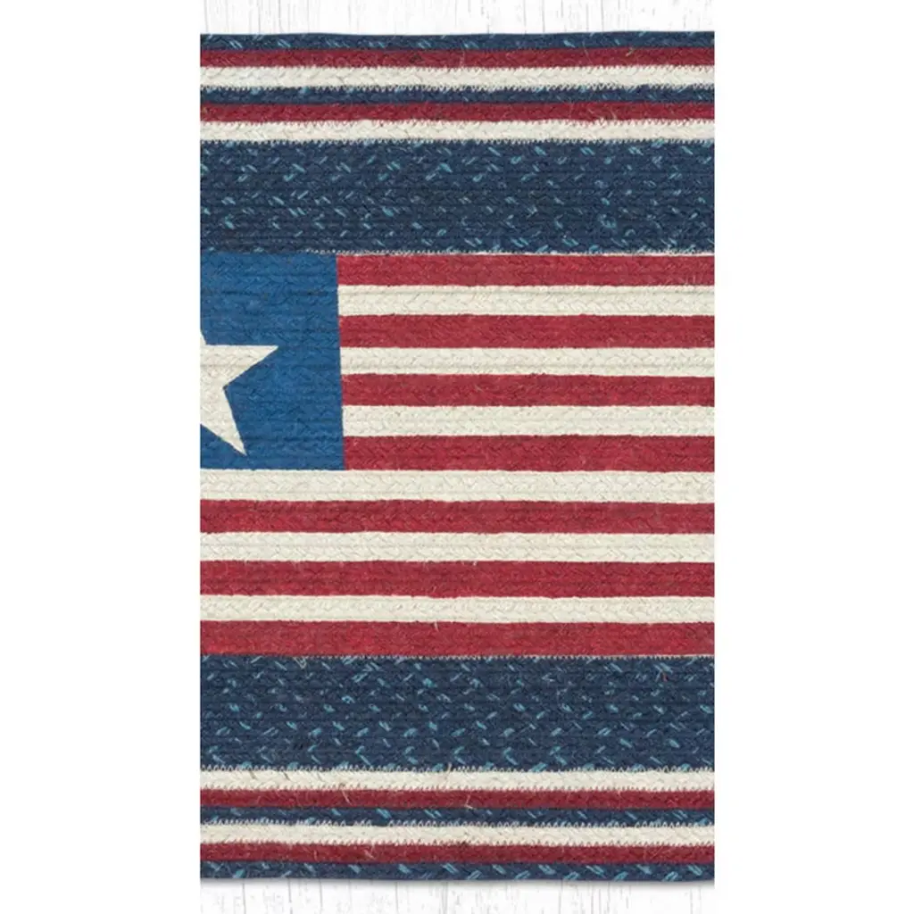 Earth Rugs USA Flag Oblong Patch Tread 20"x30" Rustic Farmhouse Americana Accent Crafted from 100% natural jute fibers, this eco-friendly rug is durable enough for everyday use while adding rustic farmhouse charm. Each rug is hand-braided and hand-stenciled, making every piece unique with authentic artisan craftsmanship. Perfect for patriotic holidays, summer gatherings, or year-round Americana decor, this rug is both decorative and functional. Key Features: Patriotic American flag design hand-stenciled on a rustic oblong braided rug. Generous 20"x30" size makes it perfect for entryways, kitchens, and living areas. Made from 100% natural jute fibers for strength, eco-friendliness, and durability. Hand-braided and stenciled for a unique, artisan-crafted Americana look. Adds rustic patriotic charm to farmhouse, lodge, or country-style homes. Durable, protective floor covering ideal for everyday use or seasonal decor. Easy care — simply spot clean with mild soap and water.