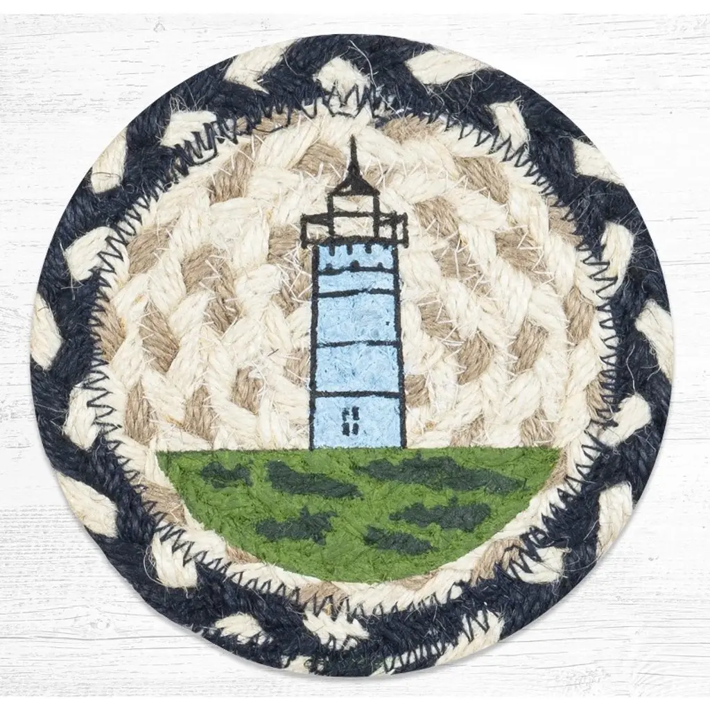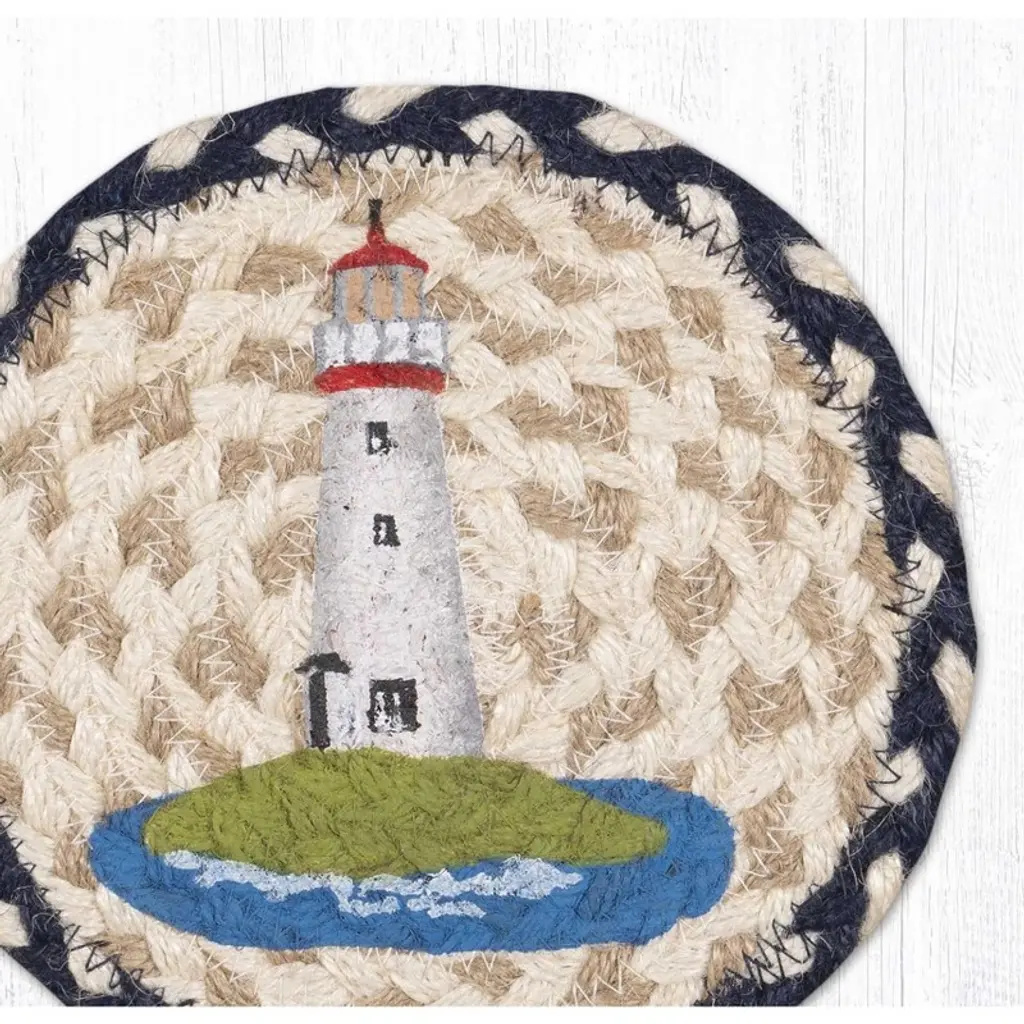 Capture the serene beauty of coastal living with the Earth Rugs White Lighthouse Round Large Coaster, sized at 7"x7". Crafted from 100% natural braided jute, this nautical accent features a hand-stenciled white lighthouse set against a warm, earthy background. The detailed stitching and braided border add textural depth, while the round shape offers generous space for mugs, candles, or small décor. Ideal for coastal cottages, beach homes, or lakefront retreats, this functional coaster protects surfaces while bringing a breezy, maritime feel to your interior. Lightweight, durable, and display-ready for everyday or seasonal use. key Features: Material: Made from durable, eco-friendly braided jute fibers Color: Natural jute with a crisp white hand-stenciled lighthouse motif Frame: No added frame – reinforced braided border maintains structure Dimensions: 7 inches in diameter – ample size for tableware or decorative accents Style: Perfect for coastal, nautical, beach house, or lake cottage themes