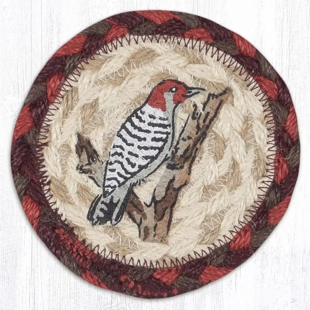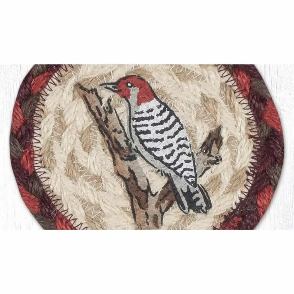 Earth Rugs Wildlife Woodpecker Round Coaster – Braided Natural Jute, Rustic Bird Design, 5"x5"