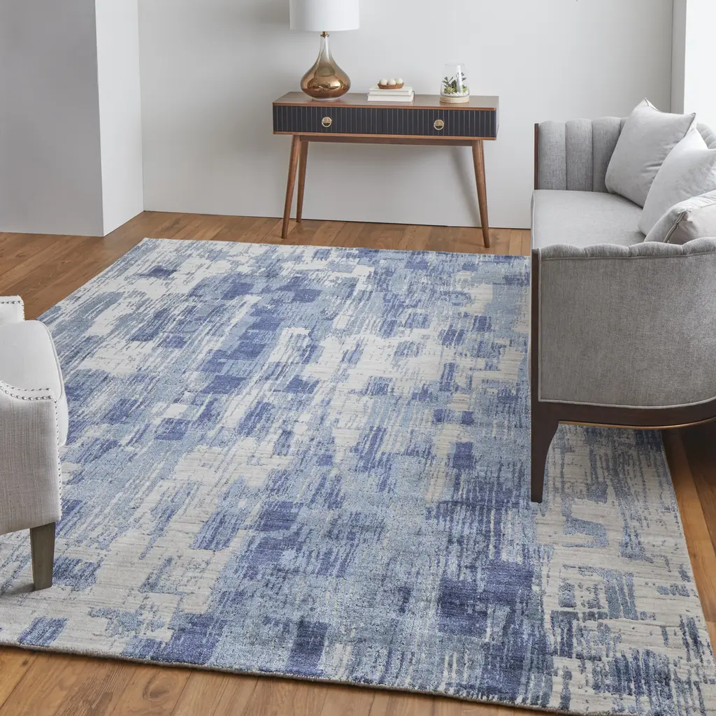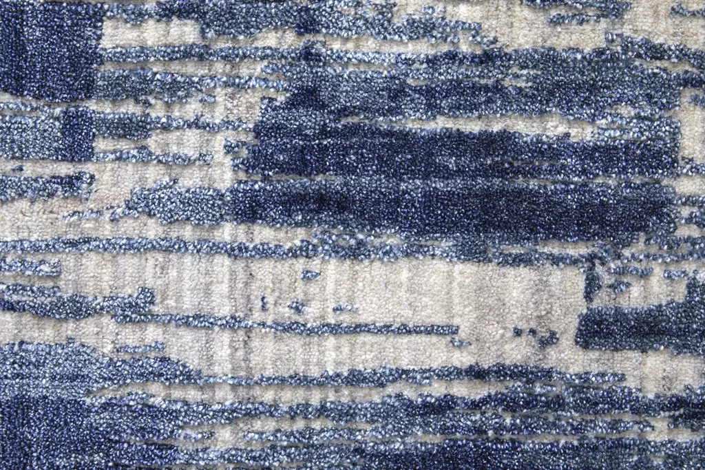 Collection: Eastfield Colors: Blue, Ivory Construction: Hand Woven Material: Face: Viscose, Wool Pile: Low Pile Pile Height: 0.39" Styles: Contemporary,Casual Backing: N/A Made In: India Thickness: 0.39" Price Range: $$$$$ (Premium)