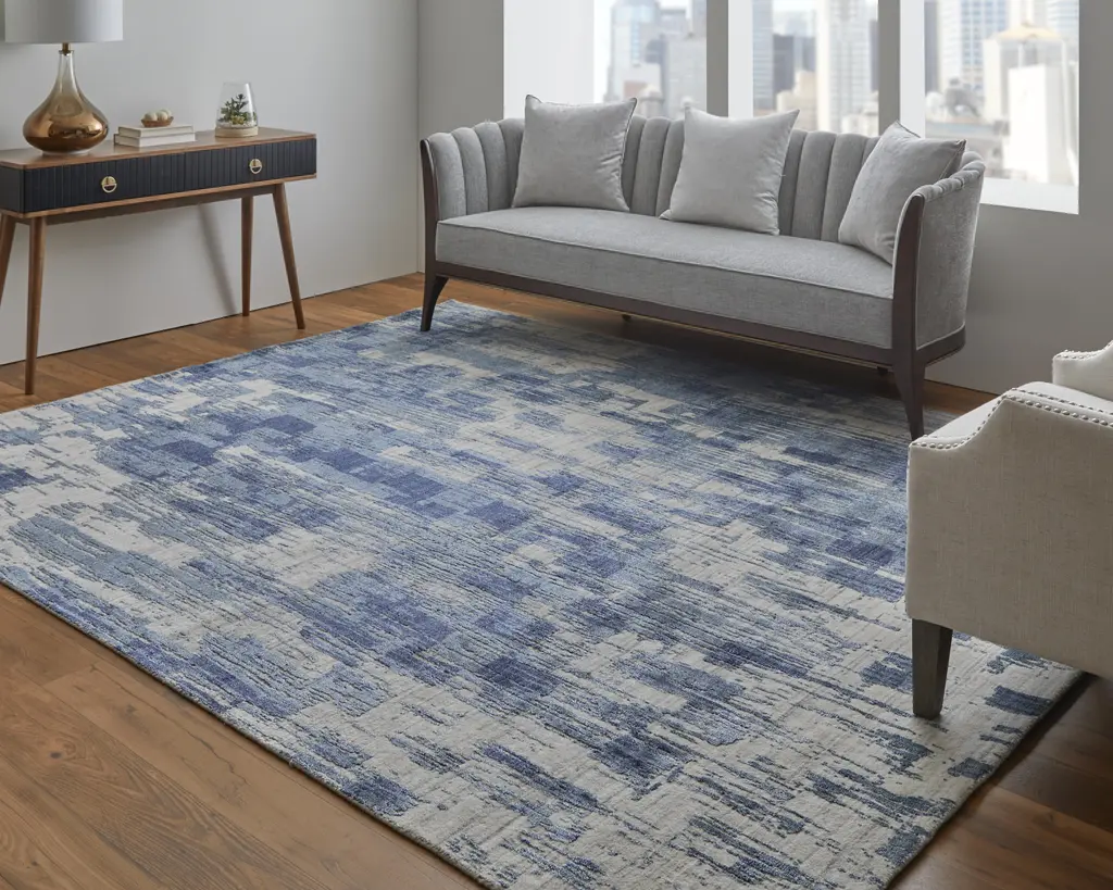 Collection: Eastfield Colors: Blue, Ivory Construction: Hand Woven Material: Face: Viscose, Wool Pile: Low Pile Pile Height: 0.39" Styles: Contemporary,Casual Backing: N/A Made In: India Thickness: 0.39" Price Range: $$$$$ (Premium)
