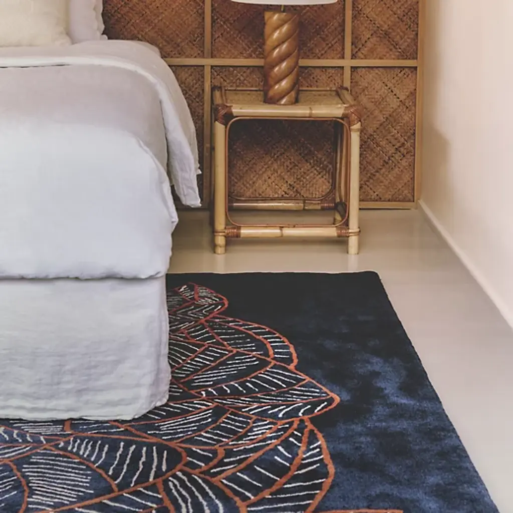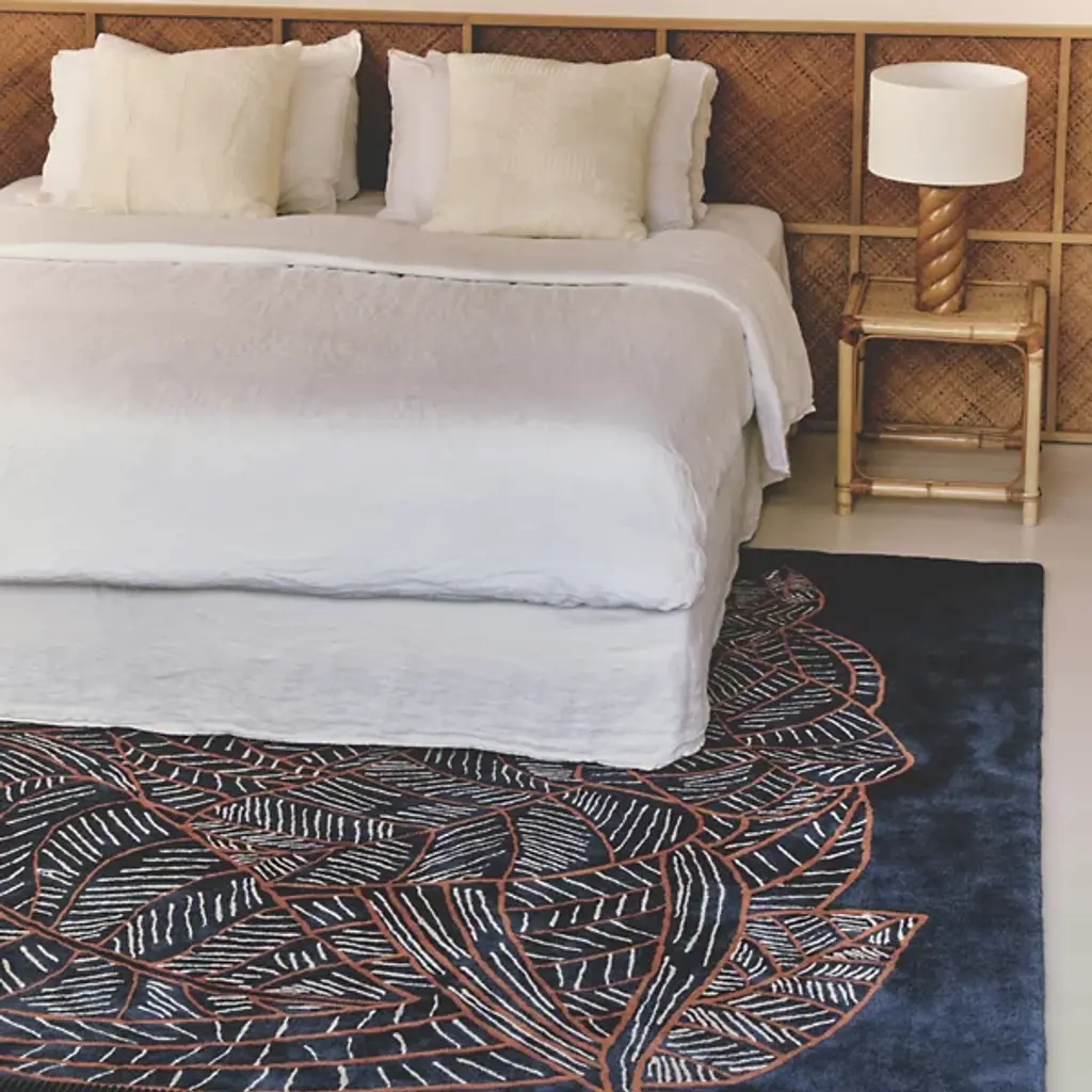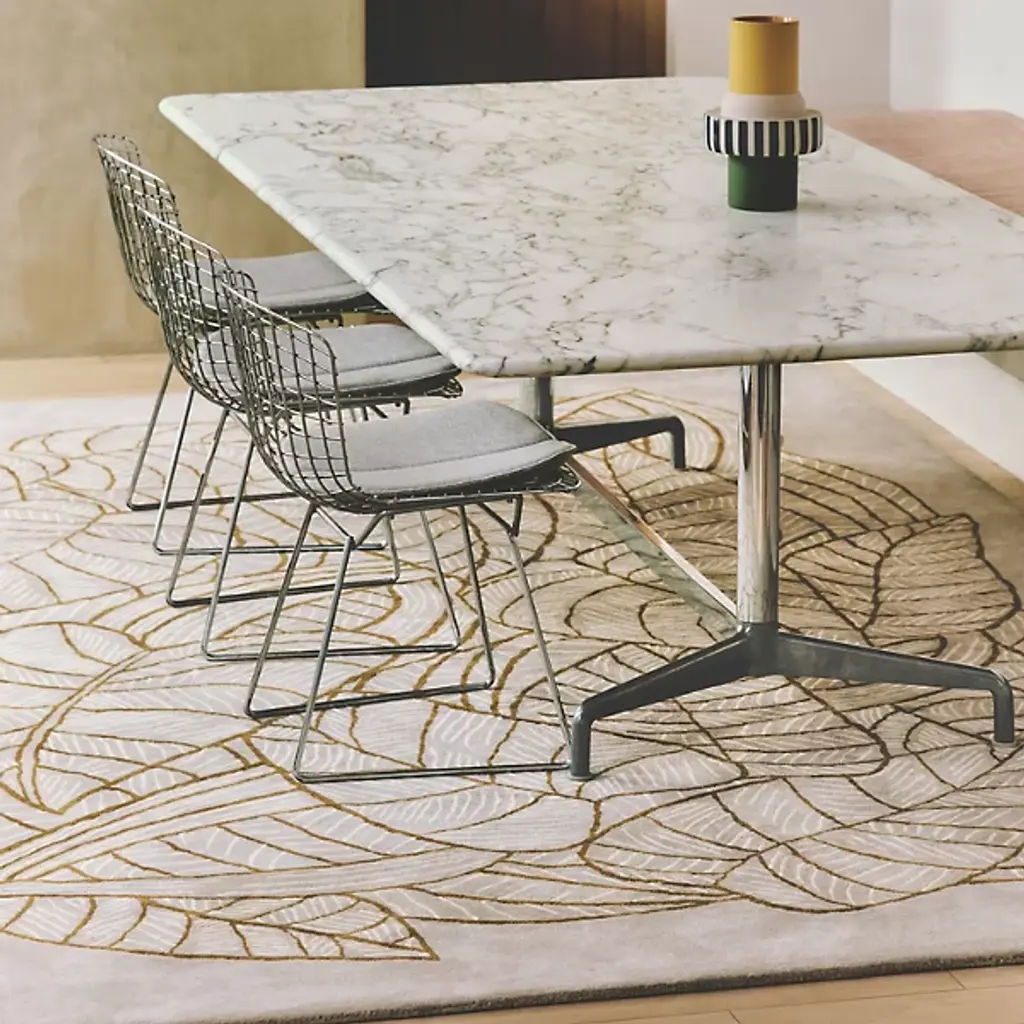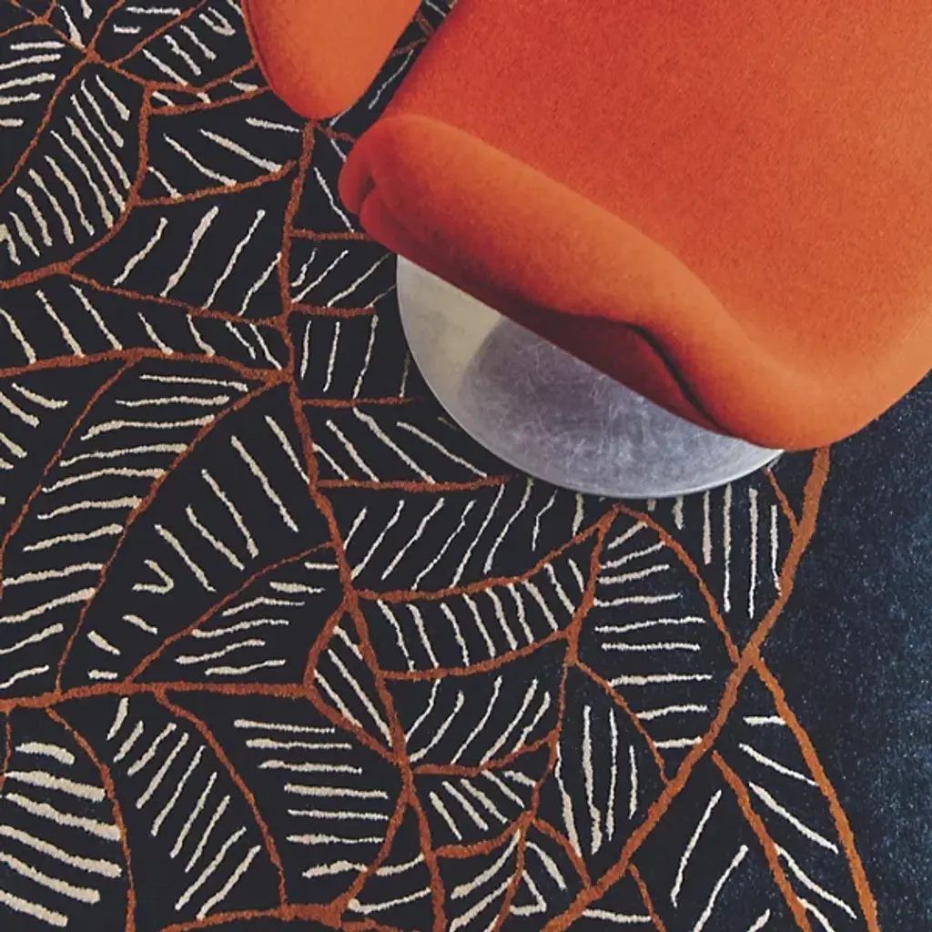 The Eden Area Rug from Toulemonde Bochart draws inspiration from tropical foliage through D. Chopard's botanical interpretation of leaf patterns and textures. This hand-tufted New Zealand wool piece features intricate vein details that run through each leaf form, creating a dense carpet of overlapping botanical elements across the surface. Each leaf seems to curl and twist independently, building up layers that suggest the lush abundance of rainforest floors. This brings natural richness indoors while providing the comfort and durability expected from premium wool construction.