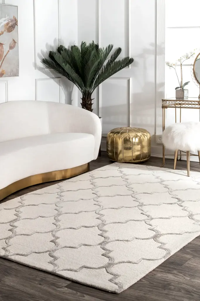 Scalloped lines combine to form an elegant trellis design in the Rugs USA Satara Edison Rug. The soft, neutral tones of this rug enhance many home decors, while the repeating quatrefoils patterned across the rug gives it a sense of contemporary sophistication. The understated elegance of the close-set trellis pattern gives it an air of luxury which causes the rug to be eye-catching but not overwhelming. Made with a blend of wool and viscose, it offers soft and luxurious comfort underfoot. This rug comes in a color choice of Dark Blue, Cocoa, Greyish Blue, Violet, Turquoise, Nickel, and Tangerine. Begin enjoying your new abode today with our pet-friendly and easy to clean area rugs.