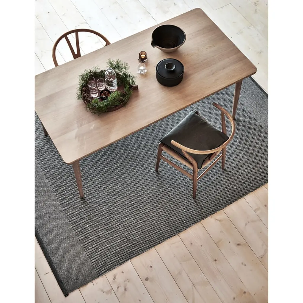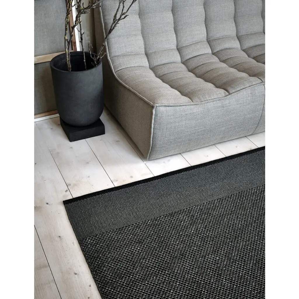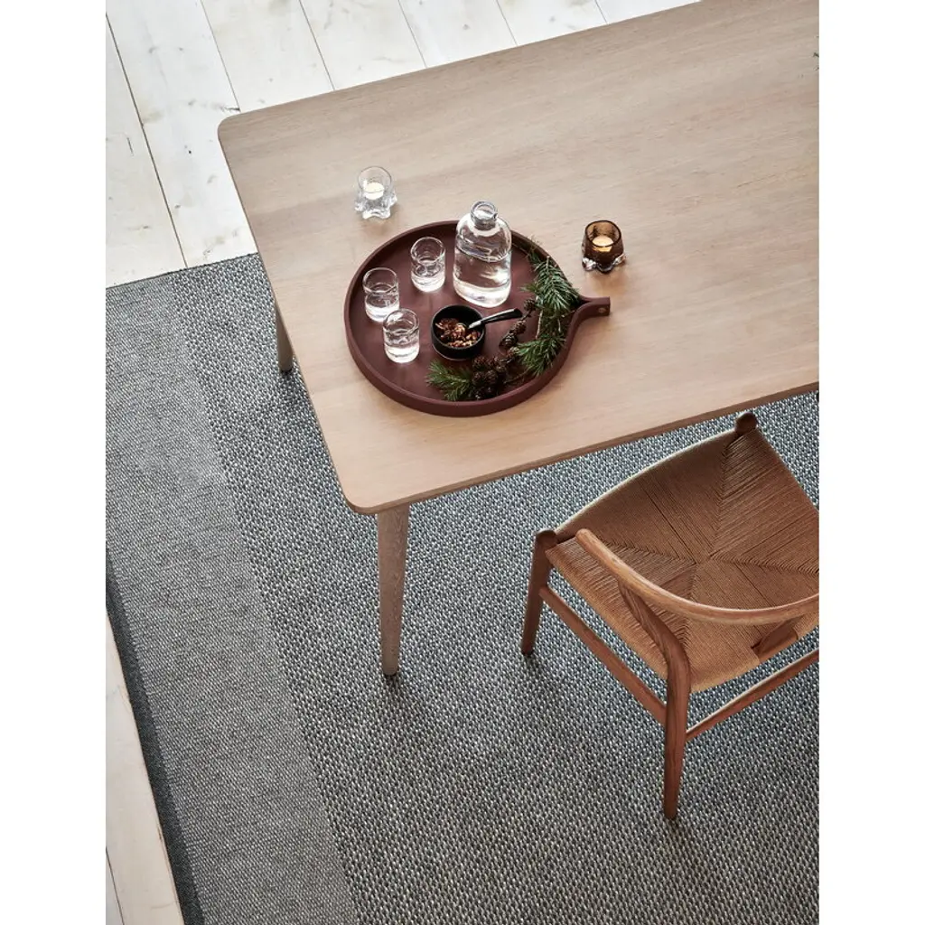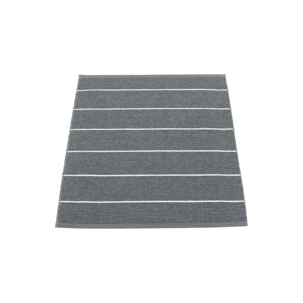 Pappelina's Edit rug features a simple and timeless pattern woven in three colors, which blend into each other forming a vivid texture with a metallic sheen. The double-folded edges are hemmed with a strong seam, and one corner has a sewn-on rubber label with a Pappelina logo. The Edit rug can be washed by hand or in a washing machine. Made of phthalate-free PVC ribbon, the plastic rug is very easy to clean, making it a practical choice for all spaces from the kids' room to the kitchen. It can even be used outdoors on the balcony, veranda or patio. Made in Dalarna, Sweden, the Edit rug has been woven using traditional techniques and it is available in several colourways.