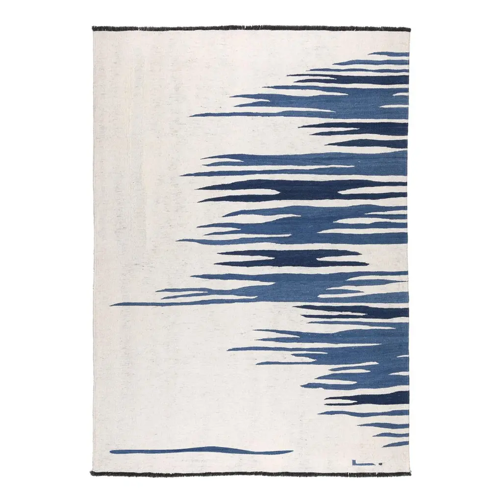 Ege No 3 kilim rug is part of a series of kilims that reflect an admiration for the visual and emotional expressiveness of the sea surface, with its fluid movements, and hues of color reflections that create a relaxing effect on the human psyche. Having blue Aegean Sea as its muse, the name for this kilim rug series is Ege, the Turkish name for Aegean.Ege is a series of kilim rugs that merge the sensibilities of centuries old craft traditions of Anatolian kilim weaving with a modern, artisanal and sensual design approach. Inspired by cultural craft traditions and the beautiful Aegean sea, Ege collection establishes a contemporary expression at the intersection of design, craft and art. Handwoven by Anatolian weavers using 100% sheep wool, Ege collection aims to bring the Aegean spirit full of sea, wind, sand and nature to the interior space.Ege Kilim Collection received EDIDA - Elle Decoration International Design Awards in 2020, in Turkey and International Silver A' Design Award in 2021.Ege kilims are handwoven by skilled Anatolian weavers based on kilim weaving technique (flat-weave). As our kilims are handwoven, there may be slight variations in colors, size and shapes. The handwoven nature gives each kilim rug its one and only and distinctive character.Material: 100% woolDimensions: 120 cm x 180 cmCan be custom sized and colored. Production lead time for custom orders is around 9-10 weeks.