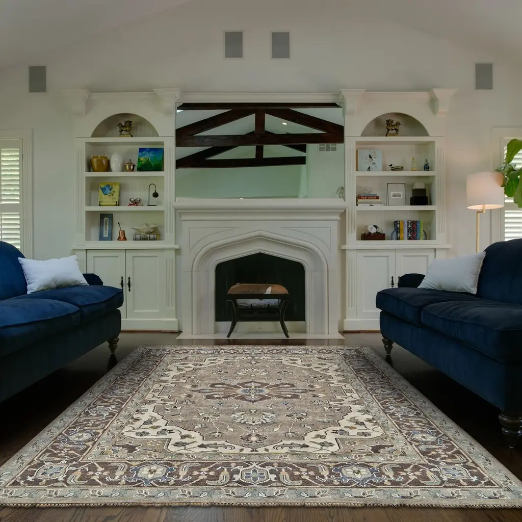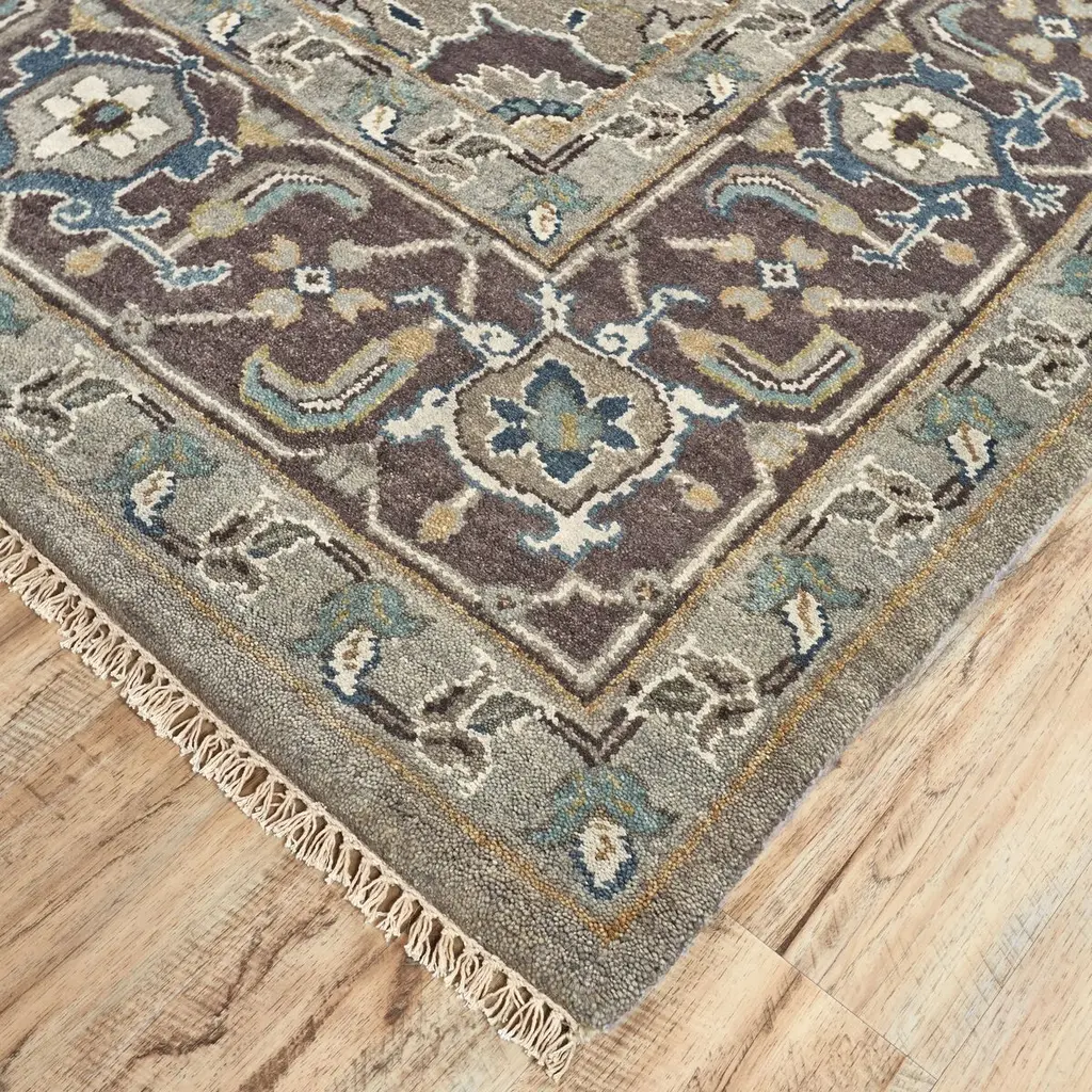 This wool rug displays traditional motifs rendered in a contemporary palette. Hand-knotted by Indian artisans, it will maintain its beauty for years, if not generations. A rug pad is recommended to help prevent slipping.