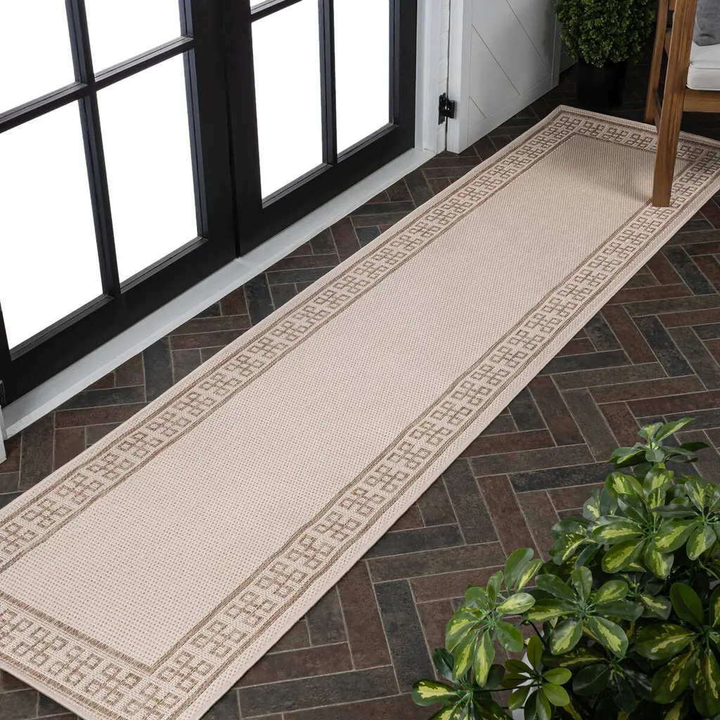 Our geometric border rug has a wide patterned stripe around the edge with a plain center field. It's woven from durable synthetic fibers in a two-tone design. Use this easy-care, family-friendly rug on the porch or deck, or in high traffic spaces like a living room, dining room or entry.