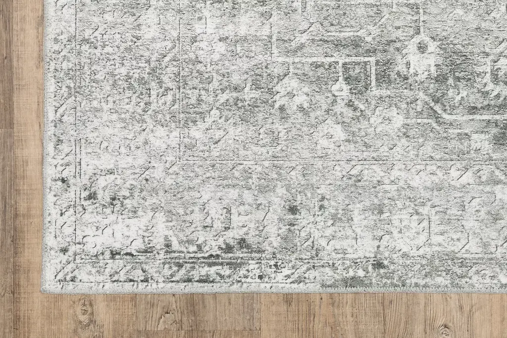 Made of 100% polyester, the Eldrige rug features an innovative, machine washable printed base with non-slip backing, perfect for high-traffic areas and family friendly living spaces. With its low-profile construction and intricate blanket stitch finish, the Eldrige rug boasts a distressed traditional design in grey and ivory tones. All sizes are machine washable and dryer friendly. Washers with agitators not recommended.