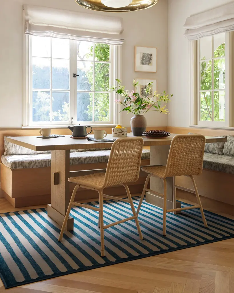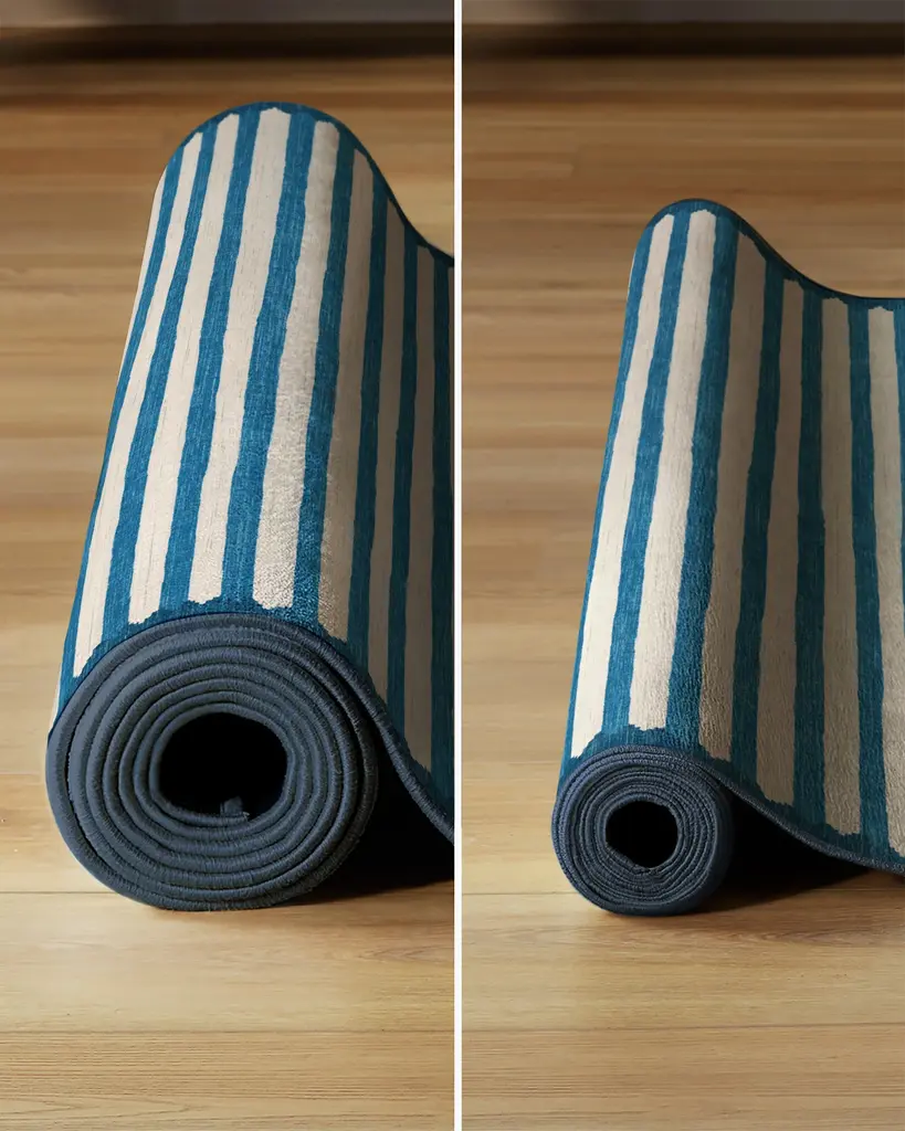 Let luxury in with our goop Elin Stripe Indigo Rug. Inspired by traditional Indian dhurrie designs, this striped style features imperfect lines and minimalist stair-stepped motif edges. Its ocean blue and bright cream colors create a classic contrast against a deep navy background. Water-resistant, stain-resistant, and machine-washable. Rug colors may vary slightly according to your device and the lighting in your space.