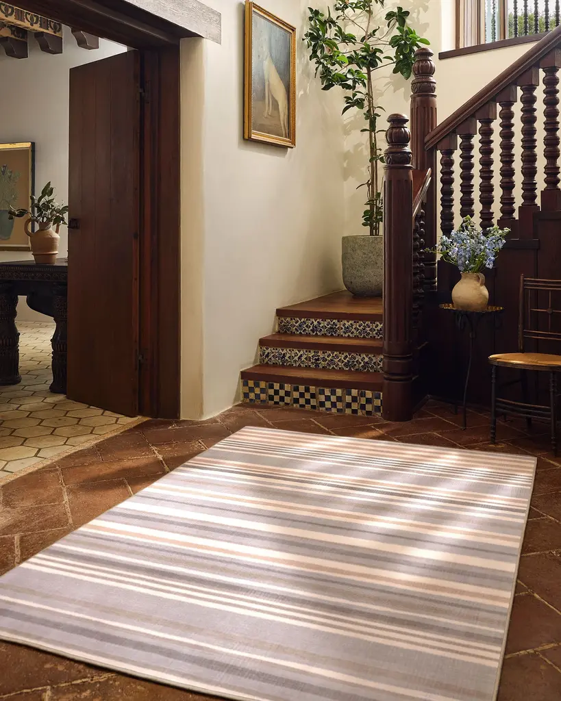 Our Elio Stripe Grey & Ivory Rug features a pattern of horizontal, neutral stripes with organic linework. Warm taupes, greys, and beige tones blend together to form a warm palette. Water-resistant, stain-resistant, and machine-washable. Rug colors may vary slightly according to your device and the lighting in your space.