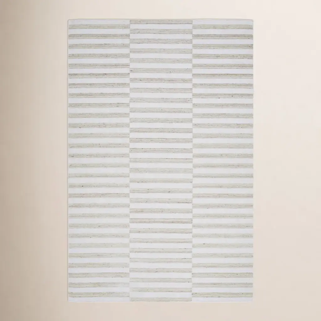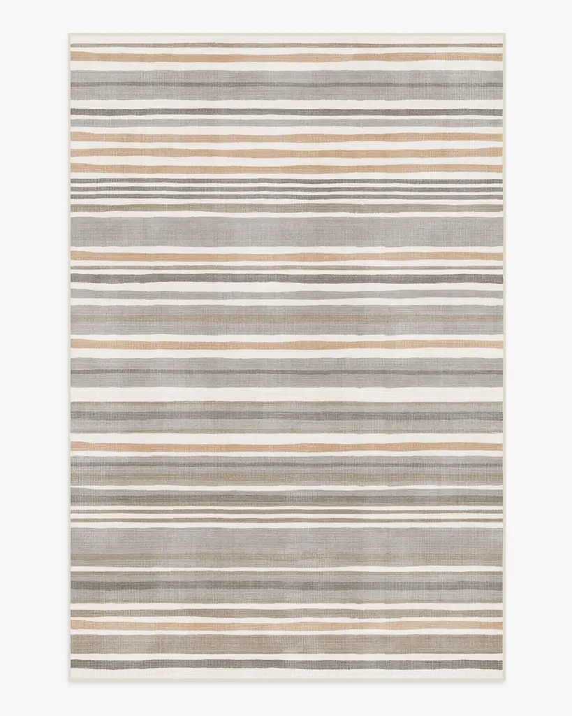 Our Elio Stripe Grey & Ivory Rug features a pattern of horizontal, neutral stripes with organic linework. Warm taupes, greys, and beige tones blend together to form a warm palette. Water-resistant, stain-resistant, and machine-washable. Rug colors may vary slightly according to your device and the lighting in your space.