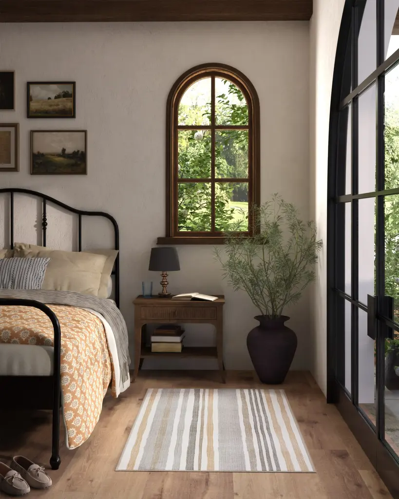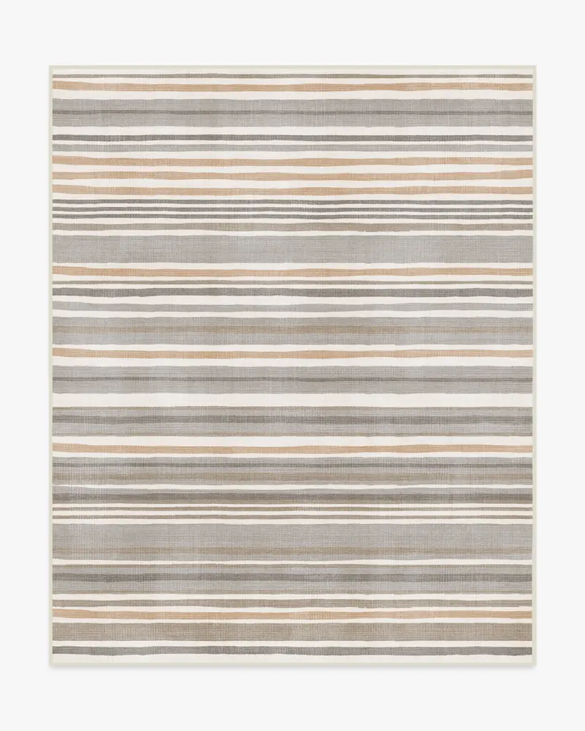 Our Elio Stripe Grey & Ivory Rug features a pattern of horizontal, neutral stripes with organic linework. Warm taupes, greys, and beige tones blend together to form a warm palette. Water-resistant, stain-resistant, and machine-washable. Rug colors may vary slightly according to your device and the lighting in your space.
