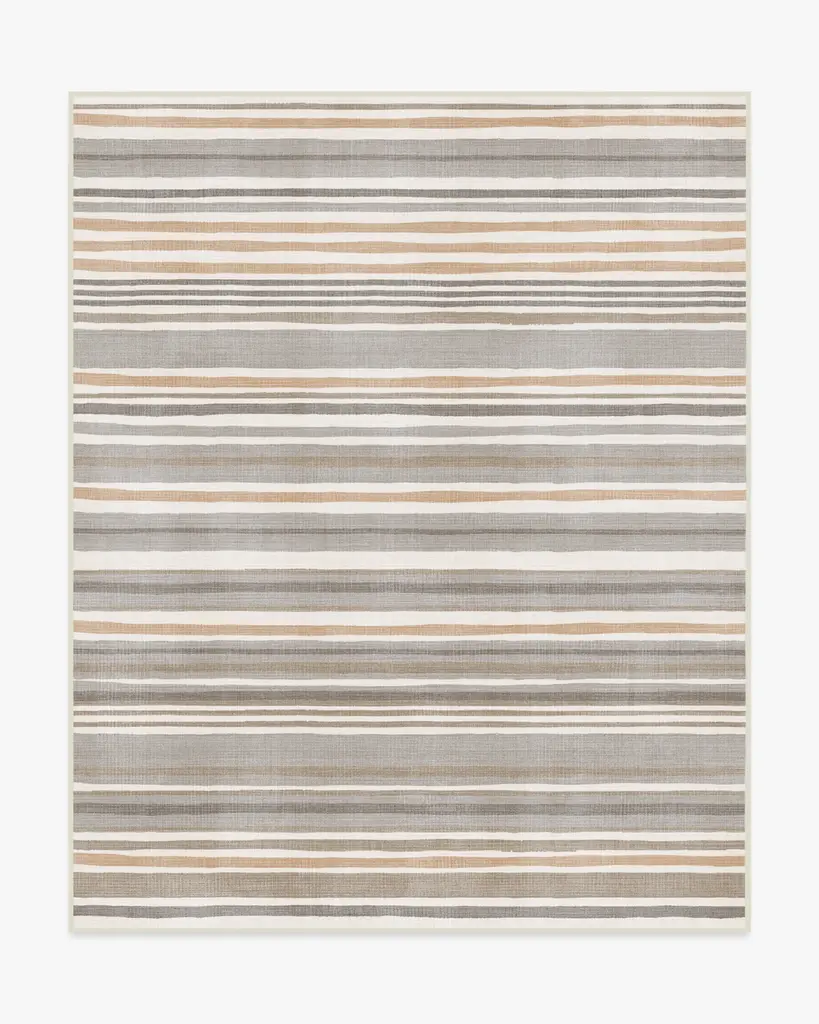 Our Elio Stripe Grey & Ivory Rug features a pattern of horizontal, neutral stripes with organic linework. Warm taupes, greys, and beige tones blend together to form a warm palette. Water-resistant, stain-resistant, and machine-washable. Rug colors may vary slightly according to your device and the lighting in your space.