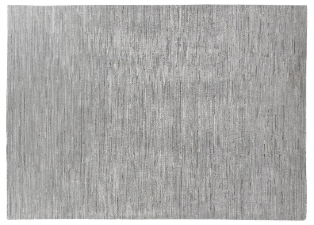 Crafted in India, this hand-knotted rug's linear, tonal designs in wool and shimmery viscose make it at once casual, chic, and ultra-sophisticated. Its silver-gray hues lend a soothing and calm feel to any space.