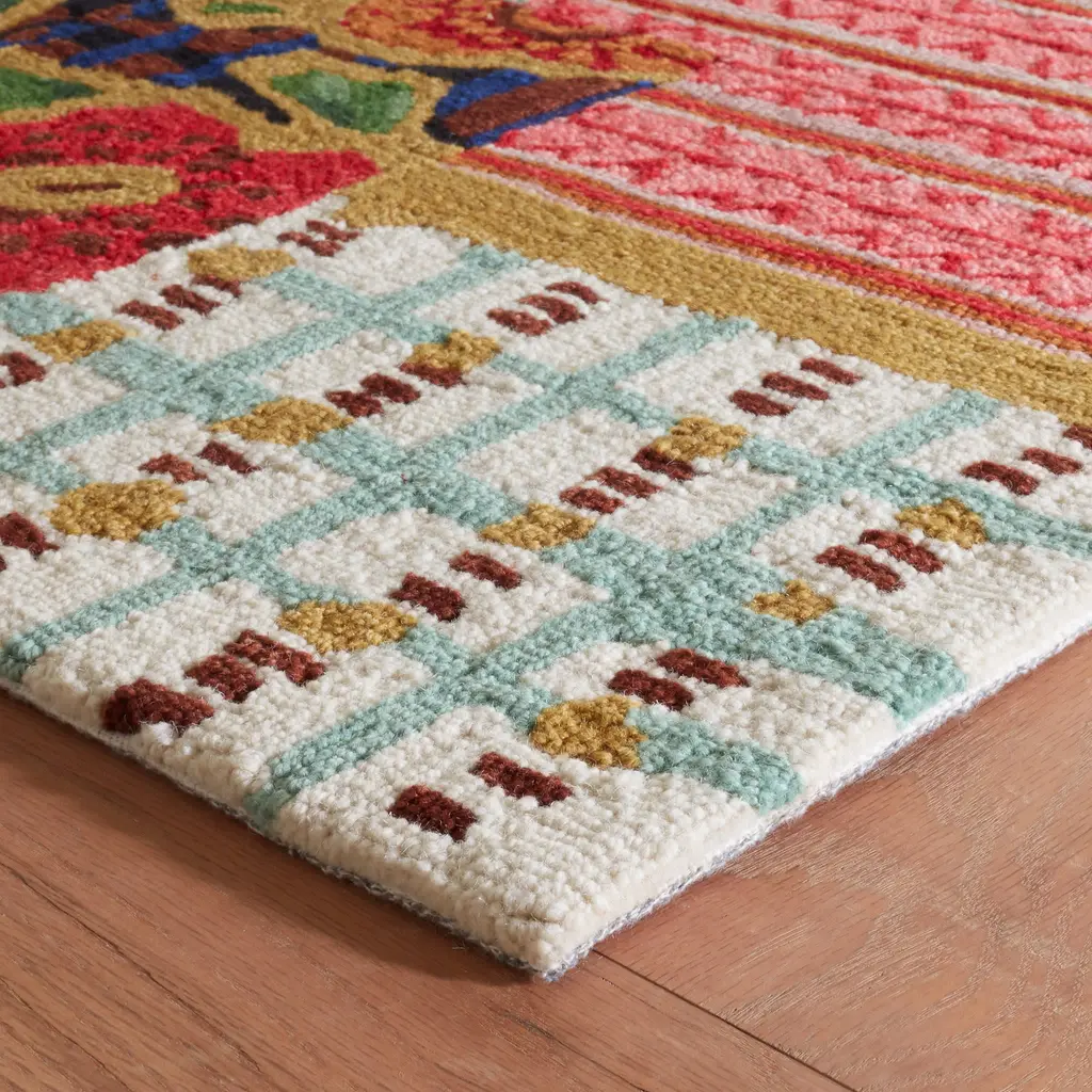 Pops of fuschia and cinnabar stand out in this patchwork-inspired, 100% wool rug, handmade in India. Inspired by a still-life painting our designers discovered and loved, it utilizes a micro-hooked wool construction that's low maintenance and designed for high-traffic areas. With a lively, artistic mix of pleasing patterns, it will add instant charm to any space.