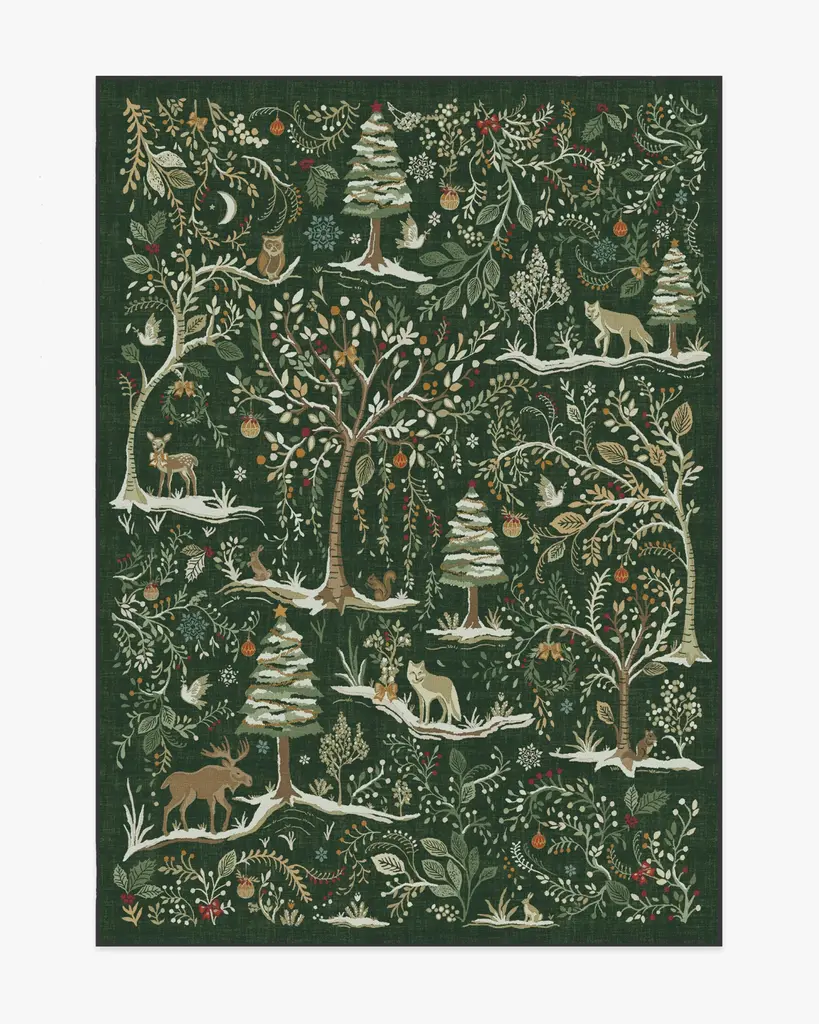 Walk onto a winter wonderland with our Elwood Forest Green Rug. This whimsical design features a snowy forest filled with woodland animals, pine trees, birch trees, and winter foliage. Seasonal touches like bows, wreaths, holly, and garland are all set against a backdrop of gently falling snowflakes. The forest green background is beautifully complemented by soft sage and warm neutral motifs, accented with pops of red, gold, and light cream details. Water-resistant, stain-resistant, and machine-washable. Rug colors may vary slightly according to your device and the lighting in your space.