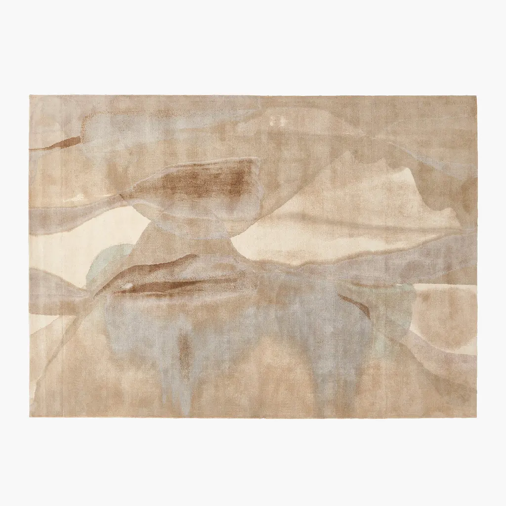 Reproduced from an original Kristin Giorgi work on linen canvas, area rug is fine art for the floor. Softly defined features of abstract landscape have a dreamy topography, with neutral colors melting into each other. Tufted and printed construction in wool/viscose blend feels soft underfoot. CB2 exclusive. How will it look in your room? 12"x12" rug samples are available in stores for a fee refundable upon return of the sample.
