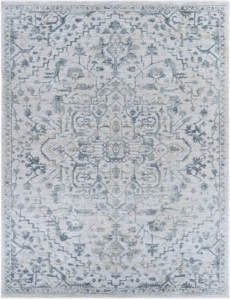 Collection: Embsay Colors: Taupe, Medium Gray, Beige, Teal Construction: Machine Woven Material: 50% Polyester, 50% Polypropylene Pile: Medium Pile Pile Height: 0.35" Styles: Traditional Made In: Turkey Thickness: 0.43" Fringe Length: 0.6" Price Range: $$$$$ (Affordable)