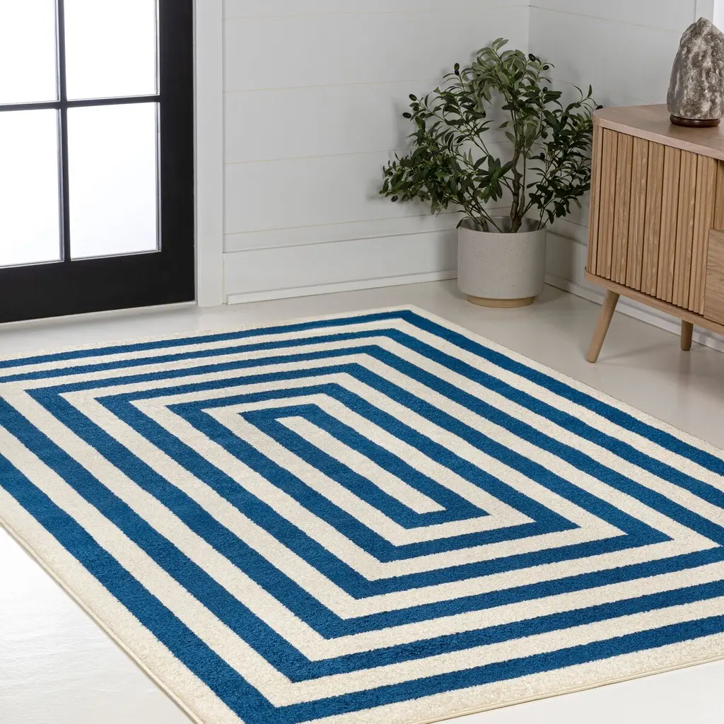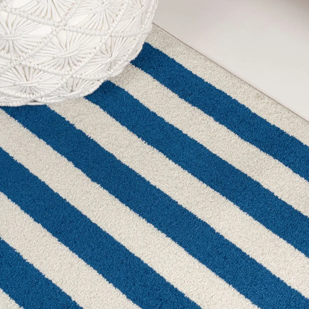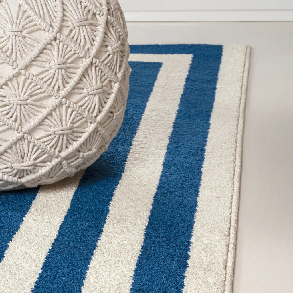 Our classic mitre-stripe design is welcome anywhere from the farmhouse to the beach. Woven from soft synthetic fibers, the crisp woven stripes turn the corners to frame the rug. Add geometric punch to your living room, dining room, bedroom or entry with this eye-catching, easy-care rug.