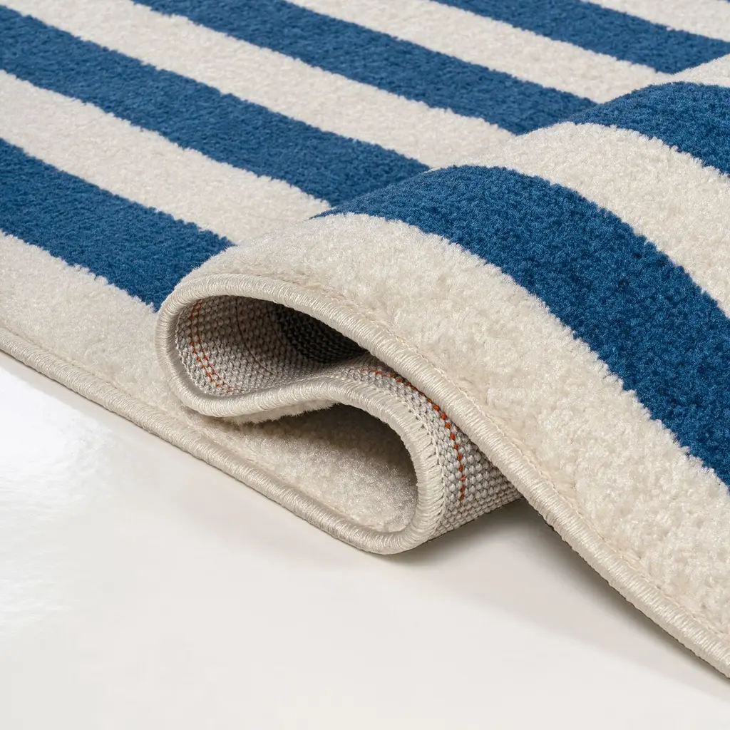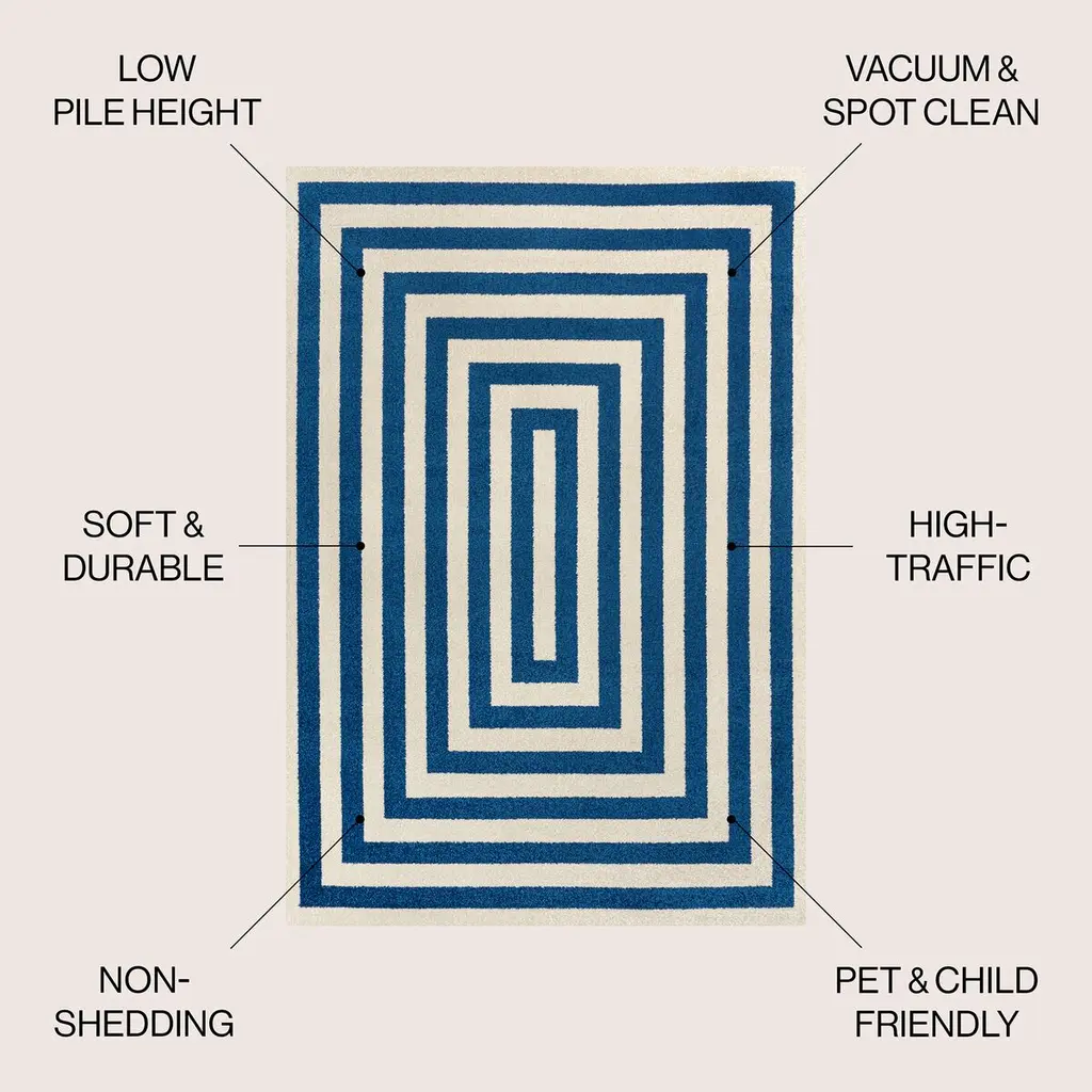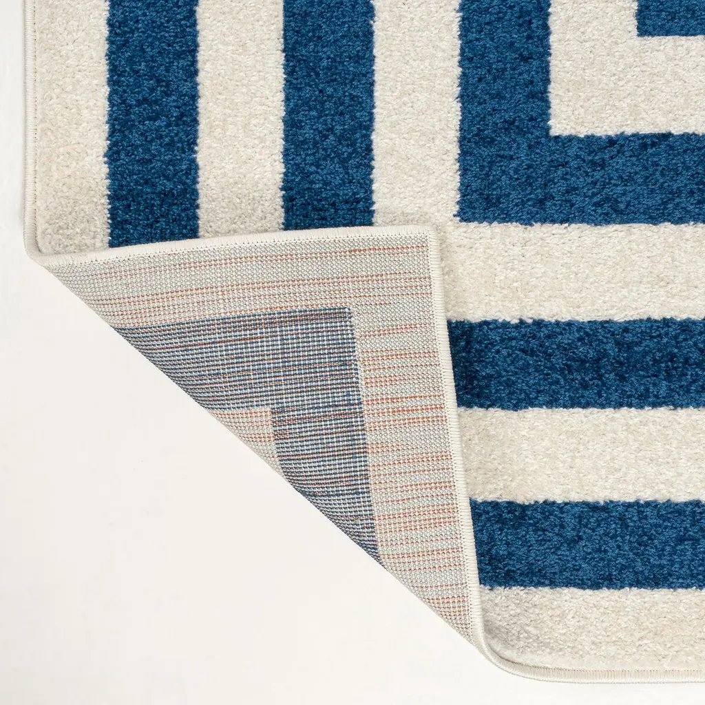 Our classic mitre-stripe design is welcome anywhere from the farmhouse to the beach. Woven from soft synthetic fibers, the crisp woven stripes turn the corners to frame the rug. Add geometric punch to your living room, dining room, bedroom or entry with this eye-catching, easy-care rug.