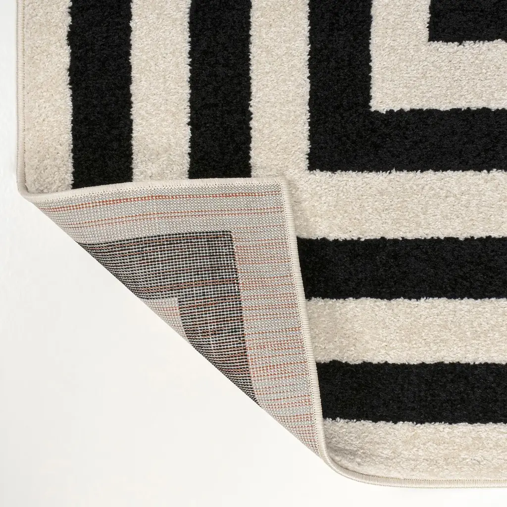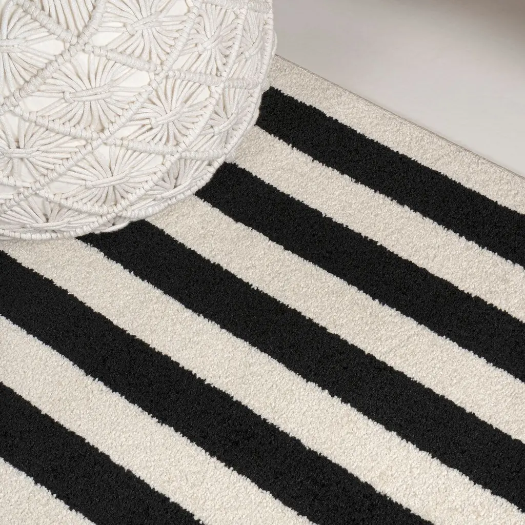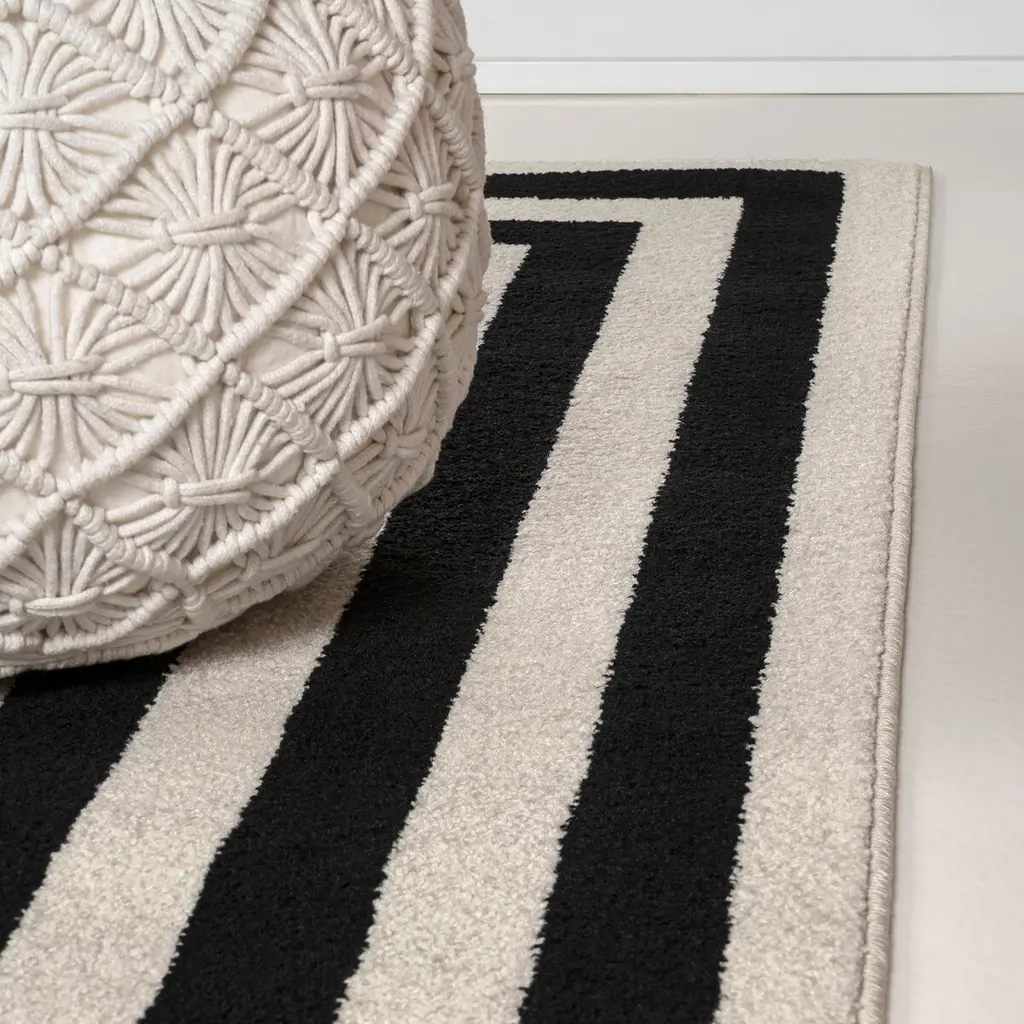 Our classic mitre-stripe design is welcome anywhere from the farmhouse to the beach. Woven from soft synthetic fibers, the crisp woven stripes turn the corners to frame the rug. Add geometric punch to your living room, dining room, bedroom or entry with this eye-catching, easy-care rug.