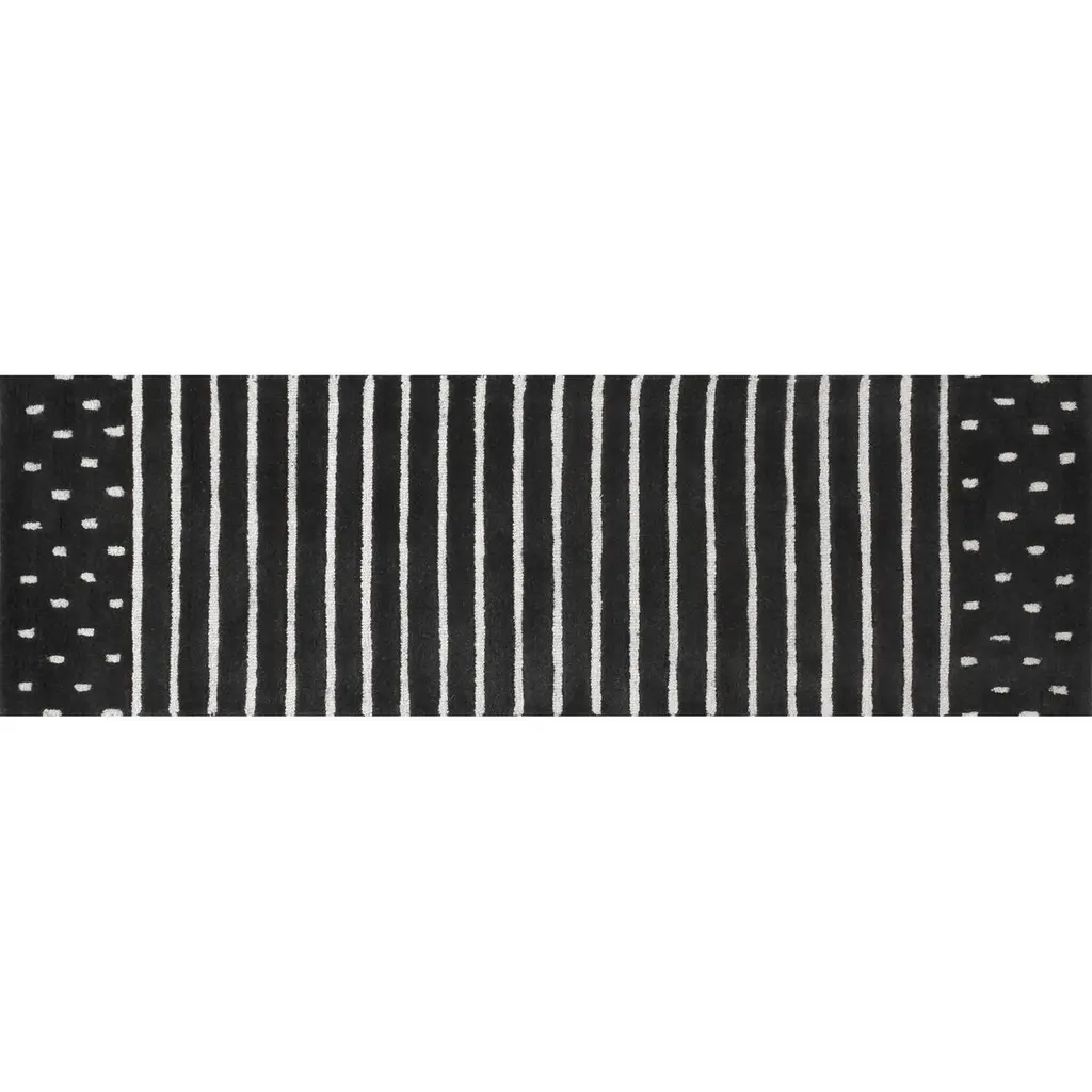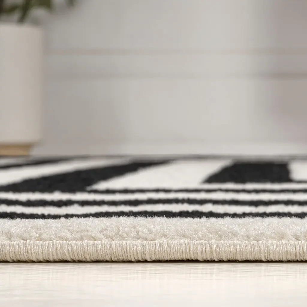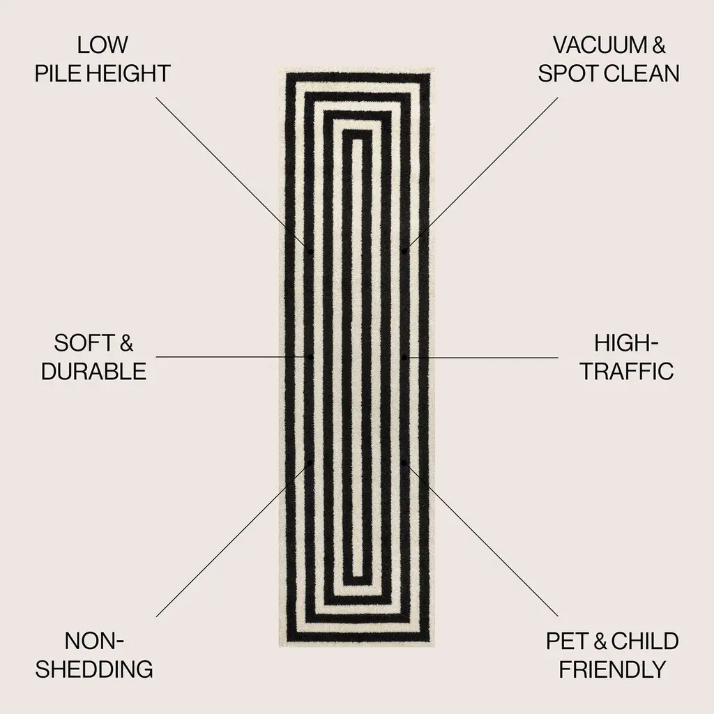 Our classic mitre-stripe design is welcome anywhere from the farmhouse to the beach. Woven from soft synthetic fibers, the crisp woven stripes turn the corners to frame the rug. Add geometric punch to your living room, dining room, bedroom or entry with this eye-catching, easy-care rug.