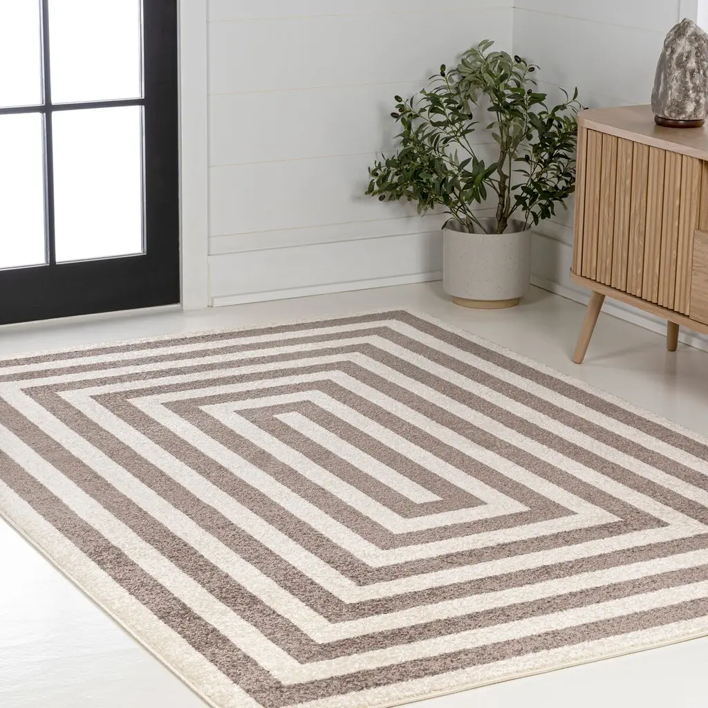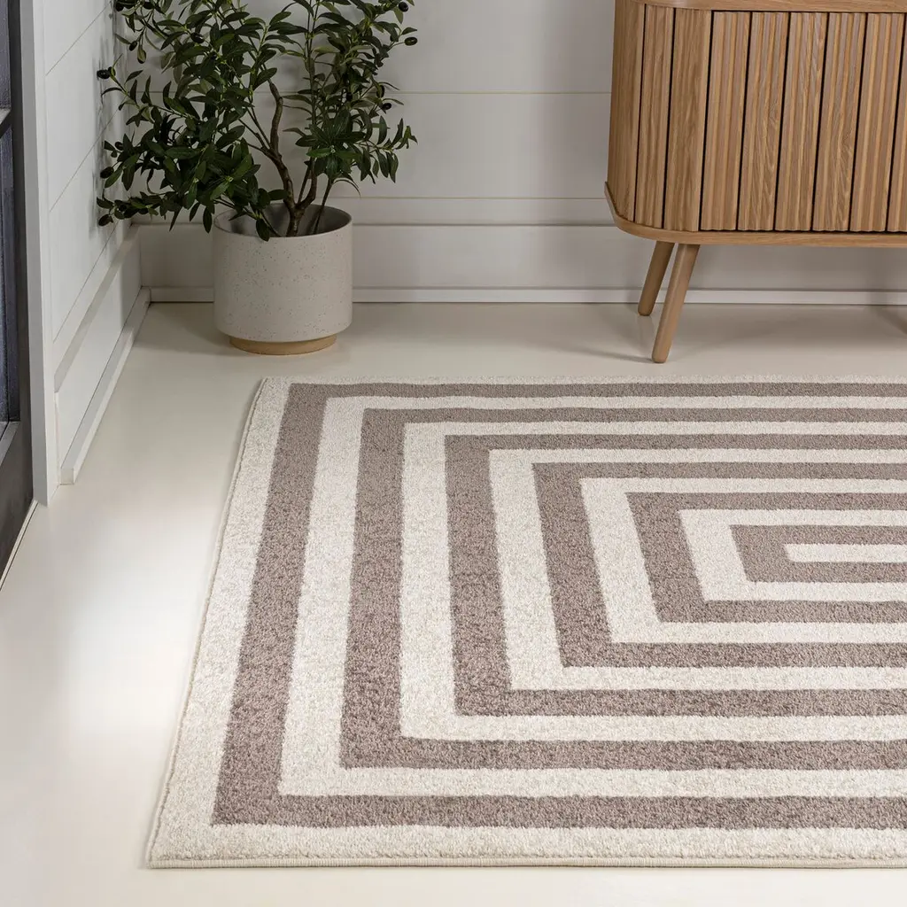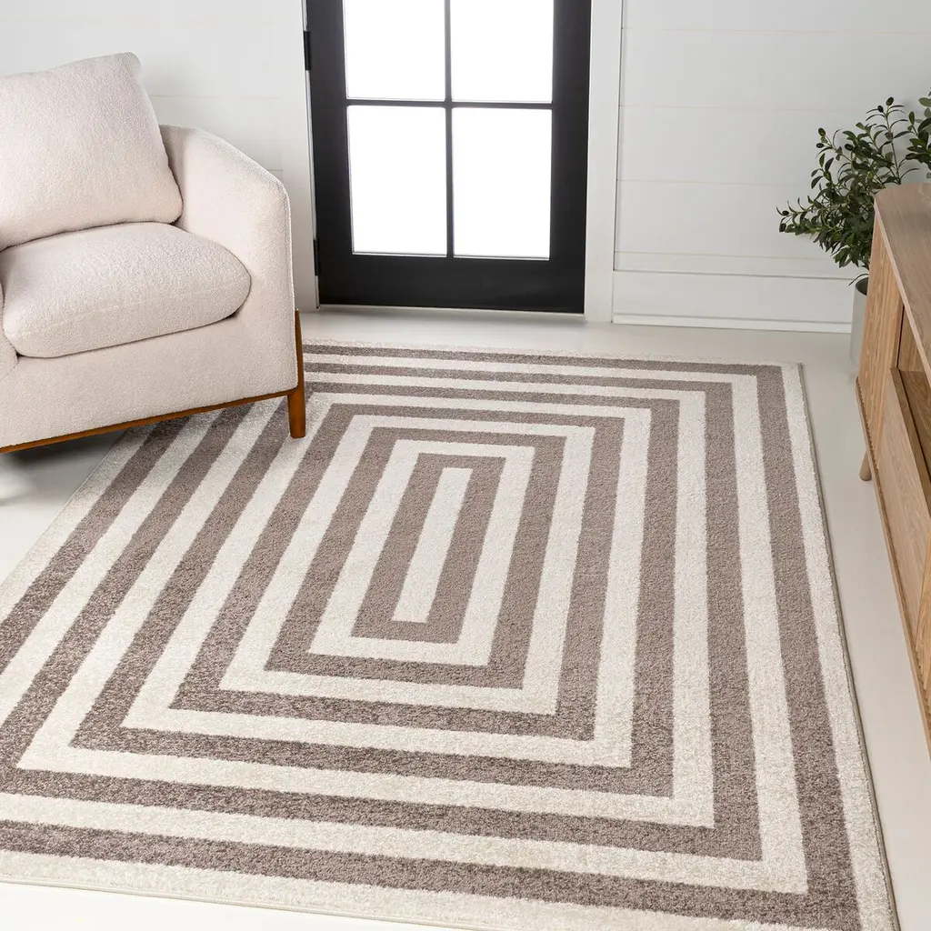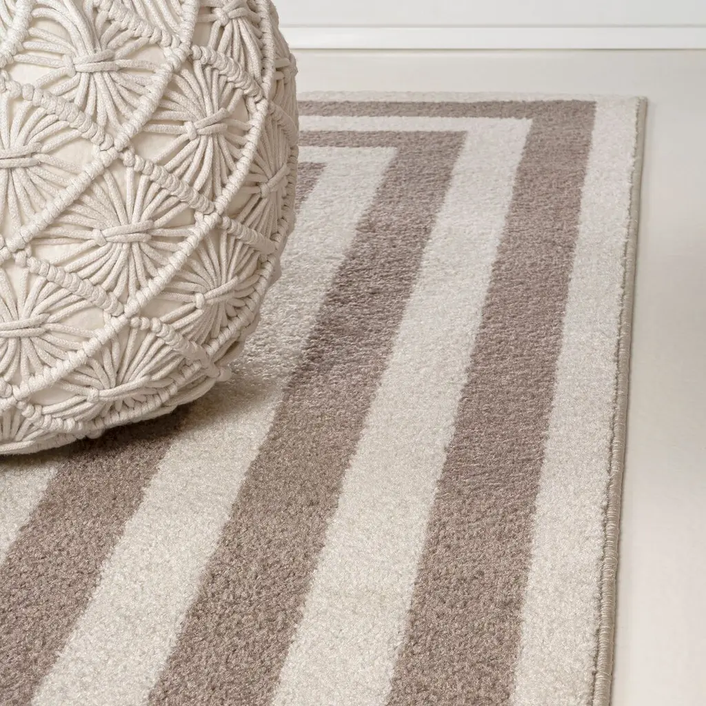 Our classic mitre-stripe design is welcome anywhere from the farmhouse to the beach. Woven from soft synthetic fibers, the crisp woven stripes turn the corners to frame the rug. Add geometric punch to your living room, dining room, bedroom or entry with this eye-catching, easy-care rug.