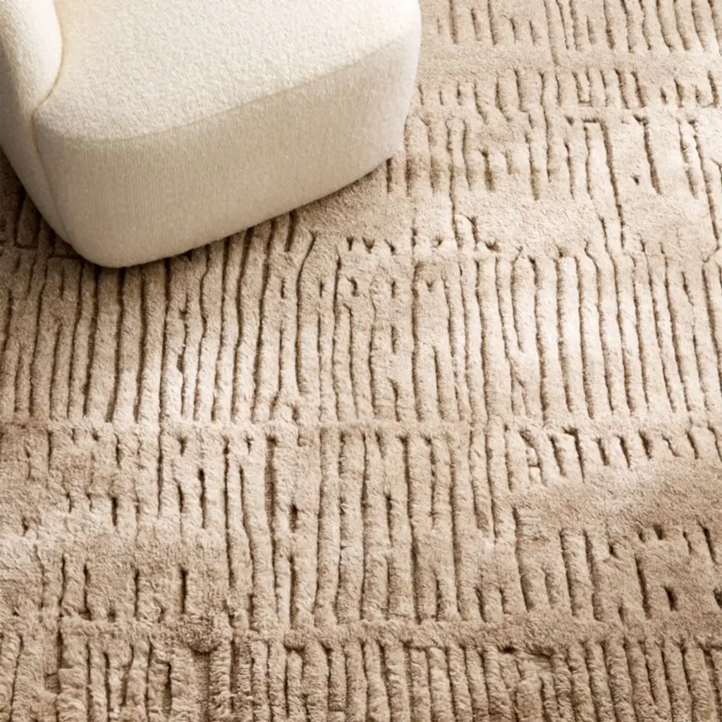 Understated and artfully composed, taupe area rug is hand-knotted from 100% New Zealand wool in a traditional Persian weave. A subtle linear pattern emerges across the low cut pileadding quiet texture and visual depth without overwhelming the space. With a fine knot density of 20 knots per square inch, this rug is well-suited for medium-traffic areas. CB2 exclusive.How will it look in your room? 12"x12" rug samples are available in stores for a fee refundable upon return of the sample.