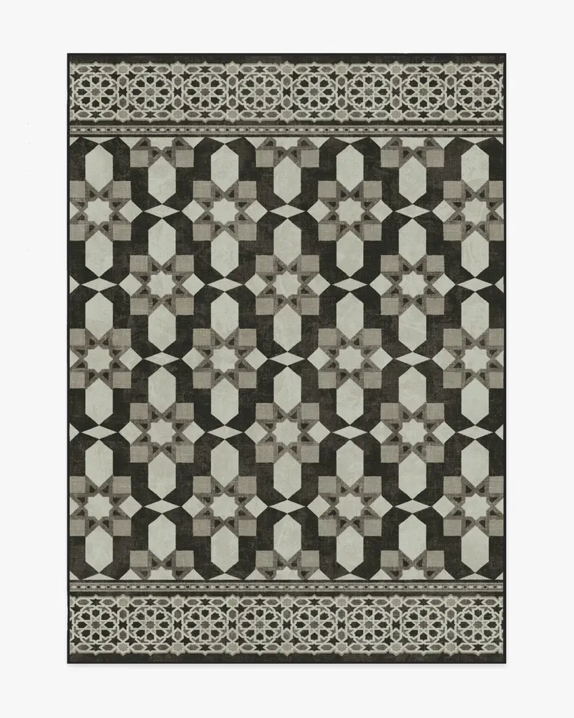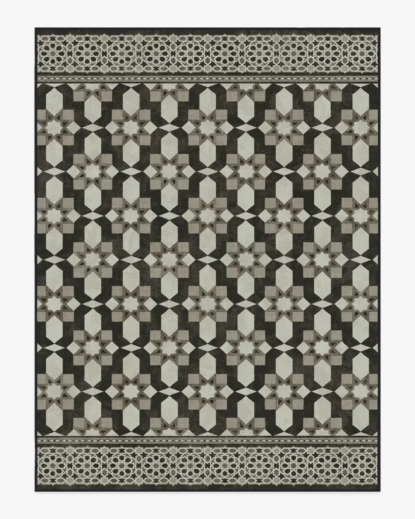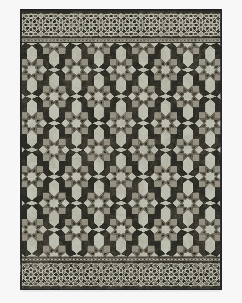 Add artisanal craftsmanship and worry-free washability to your home with our Martyn Lawrence Bullard Emir Black & Ivory Rug. Inspired by the exquisite patterns of Moroccan inlay tilework, this symmetrical design artfully juxtaposes intricate motifs to create a stunning geometric trellis. The depth and complexity of the pattern are enhanced by an ivory background, complemented by warm charcoal and grey variations. Water-resistant, stain-resistant, and machine-washable. Rug colors may vary slightly according to your device and the lighting in your space.