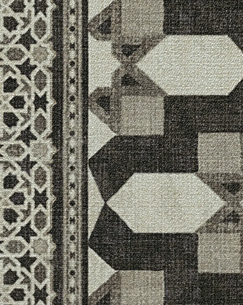 Add artisanal craftsmanship and worry-free washability to your home with our Martyn Lawrence Bullard Emir Black & Ivory Rug. Inspired by the exquisite patterns of Moroccan inlay tilework, this symmetrical design artfully juxtaposes intricate motifs to create a stunning geometric trellis. The depth and complexity of the pattern are enhanced by an ivory background, complemented by warm charcoal and grey variations. Water-resistant, stain-resistant, and machine-washable. Rug colors may vary slightly according to your device and the lighting in your space.