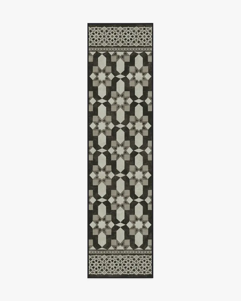 Add artisanal craftsmanship and worry-free washability to your home with our Martyn Lawrence Bullard Emir Black & Ivory Rug. Inspired by the exquisite patterns of Moroccan inlay tilework, this symmetrical design artfully juxtaposes intricate motifs to create a stunning geometric trellis. The depth and complexity of the pattern are enhanced by an ivory background, complemented by warm charcoal and grey variations. Water-resistant, stain-resistant, and machine-washable. Rug colors may vary slightly according to your device and the lighting in your space.