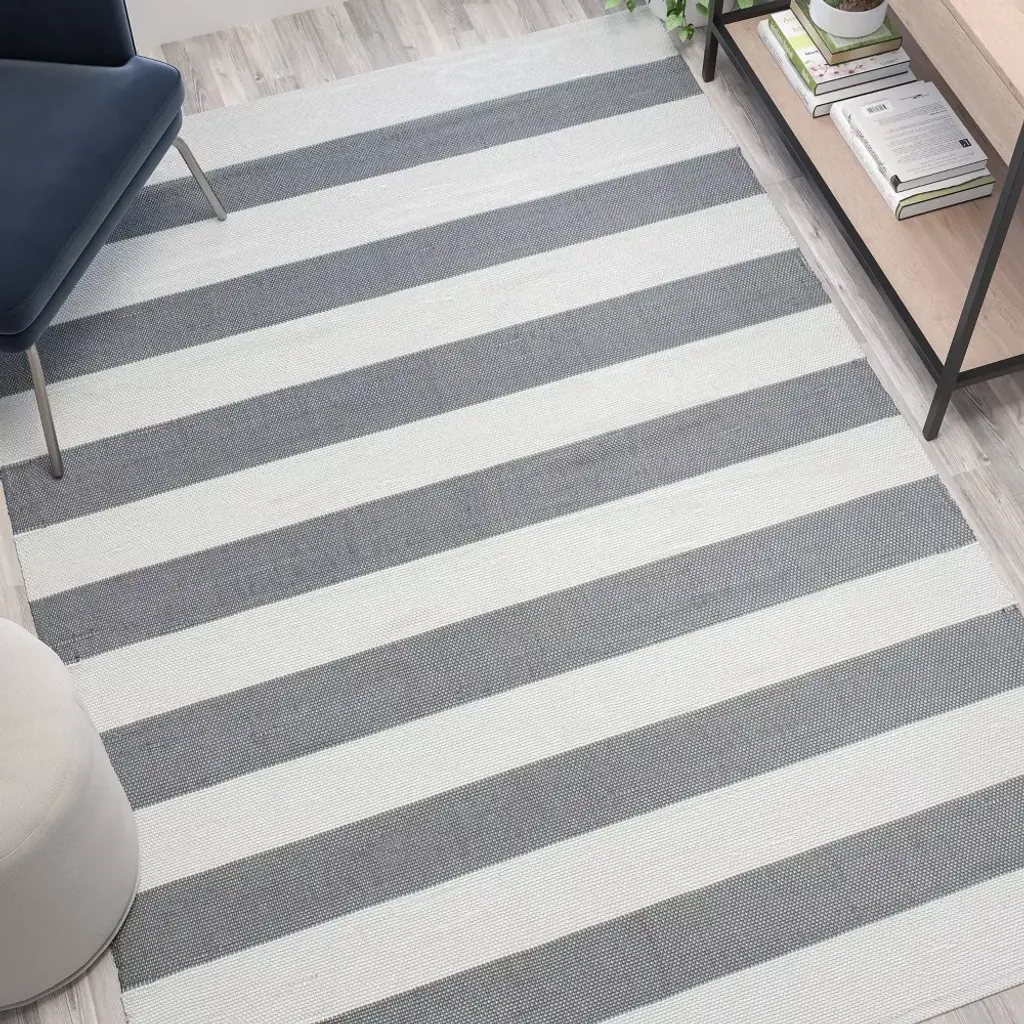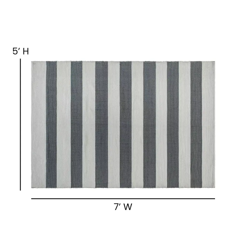 Long lasting comfort paired with a budget-friendly price point make this indoor/outdoor grey and white striped cabana style area rug ideal for busy families. The neutral palette blends beautifully with your indoor furniture or deck or patio set to instantly transform the look of your space. Strong synthetic handwoven polypropylene fibers can absorb water without growing mold or mildew and are ideal for high moisture areas such as kitchens, bathrooms, entryways and decks. Use this rug under your poolside furniture to prevent contact with hot walking surfaces while you relax. Low maintenance is always an important factor for the modern lifestyle and this handwoven area rug won't disappoint. Polypropylene area rugs are abrasion and UV-resistant and repel most stains, making them easy to clean. Synthetic fibers repel allergens inhibiting the growth of allergy triggers. Whether you're decorating indoors or outdoors, take your design to the next level with the casual elegance of this multipurpose area rug.