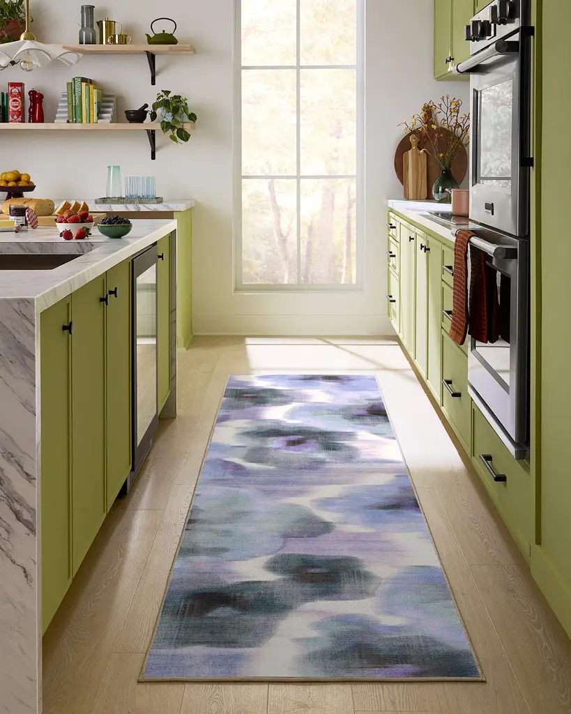 Welcome home the dreamlike beauty of our Emma Lavender Rug. Inspired by the ethereal qualities of bokeh effects and watercolor paintings, this design features a horizontal blur of flowers in a mix of lavender tones paired with light cream. Water-resistant, stain-resistant, and machine-washable. Rug colors may vary slightly according to your device and the lighting in your space.