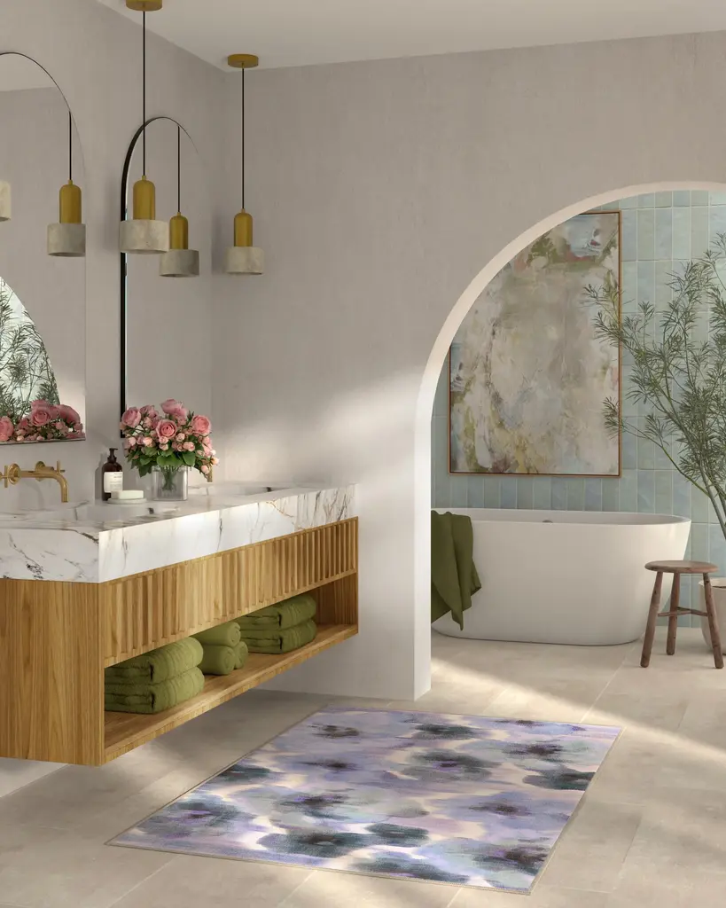 Welcome home the dreamlike beauty of our Emma Lavender Rug. Inspired by the ethereal qualities of bokeh effects and watercolor paintings, this design features a horizontal blur of flowers in a mix of lavender tones paired with light cream. Water-resistant, stain-resistant, and machine-washable. Rug colors may vary slightly according to your device and the lighting in your space.