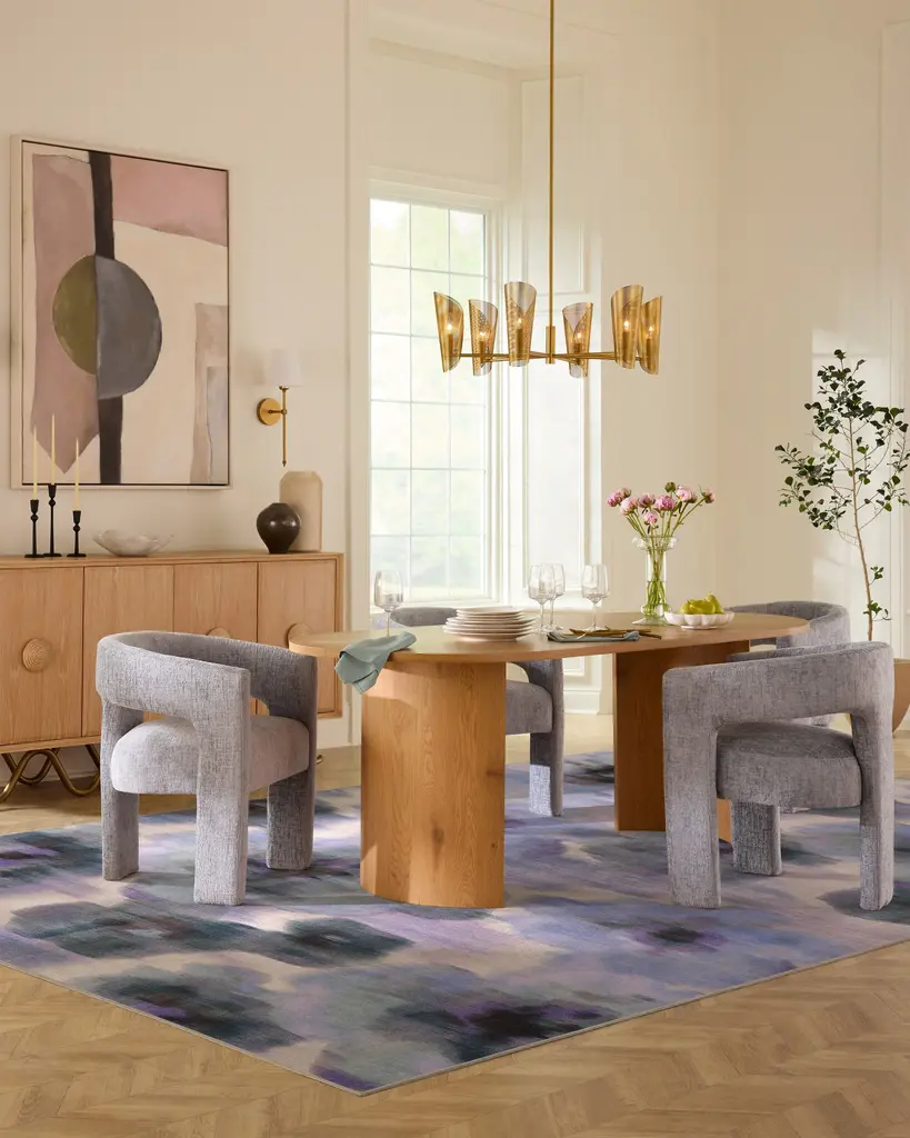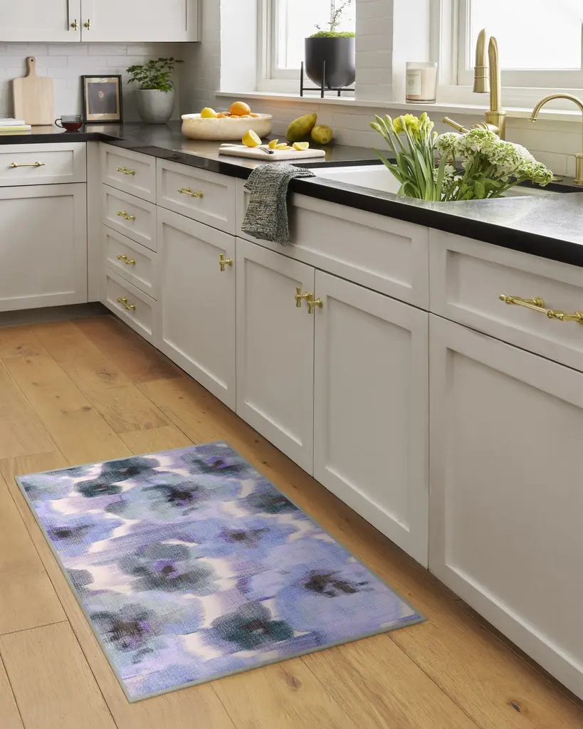 Welcome home the dreamlike beauty of our Emma Lavender Rug. Inspired by the ethereal qualities of bokeh effects and watercolor paintings, this design features a horizontal blur of flowers in a mix of lavender tones paired with light cream. Water-resistant, stain-resistant, and machine-washable. Rug colors may vary slightly according to your device and the lighting in your space.