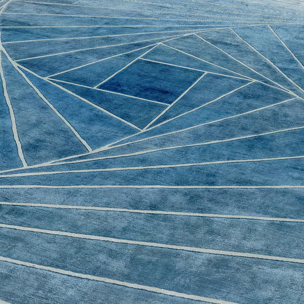 The intriguing involvement that optical art arises in the observer inspired the hypnotizing design of this rug, composed of 80% silk and 20% Himalayan wool weft together by Nepalese master artisans. Featuring a .07cm-high design, a .05cm-high base, and a density of 152,000 knot/sqm, the piece is distinguished by the striking illusion of a blue vortex with blurred edges. Multiple customizations and an anti-stain treatment are also available, please contact the Concierge.