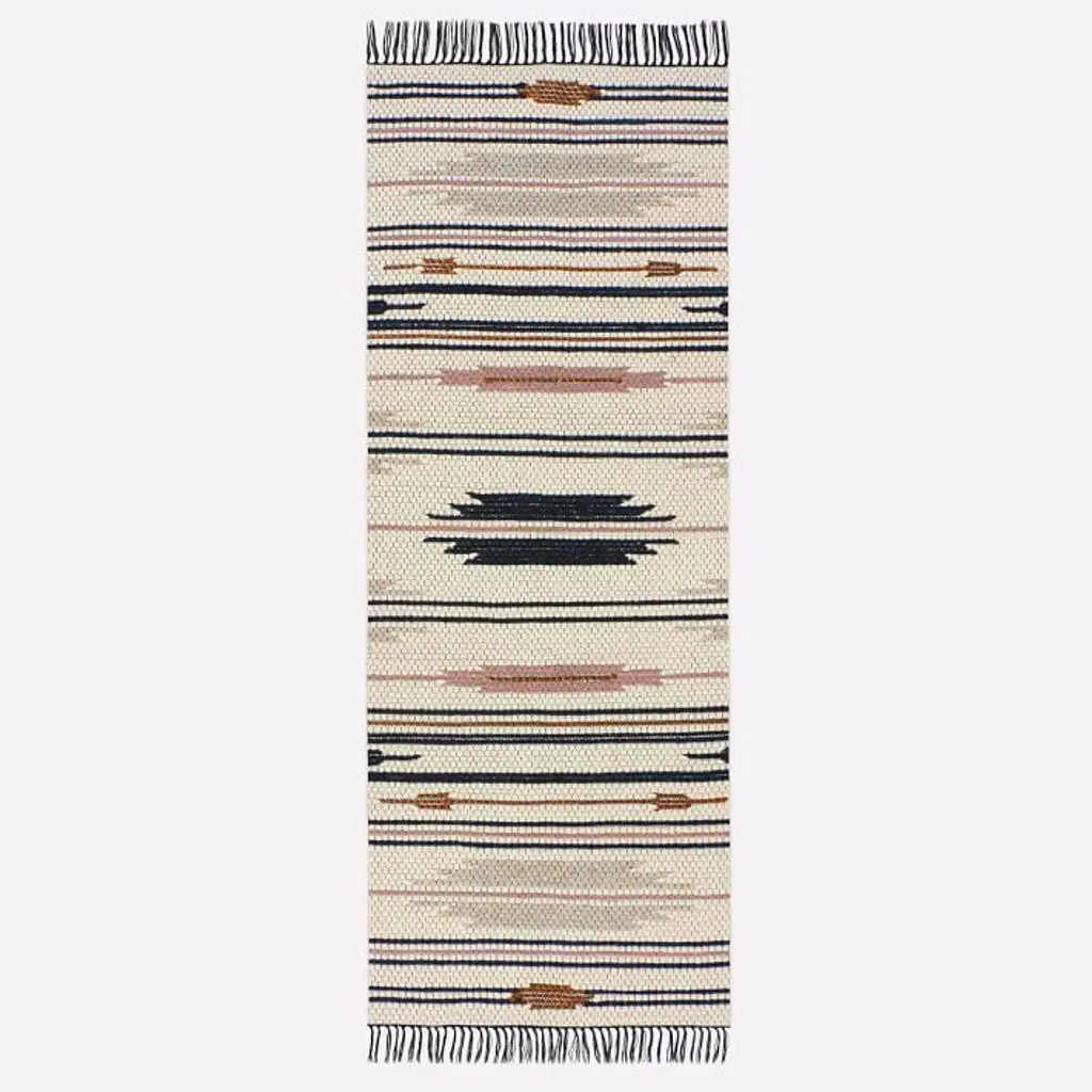 Inspired by Southwestern motifs, each intricate Entwine Rug is handwoven in India from a blend of wool and cotton in neutral colors to ground your space. 70% wool, 20% cotton, 10% lurex in Stone White. Rug thickness: 0.4". Handwoven. Shedding is common with new wool rugs and will diminish over time. No backing. Rug Pad recommended (sold separately). Made in a Fair Trade Certified™ factory, empowering workers who made it. Made in India.