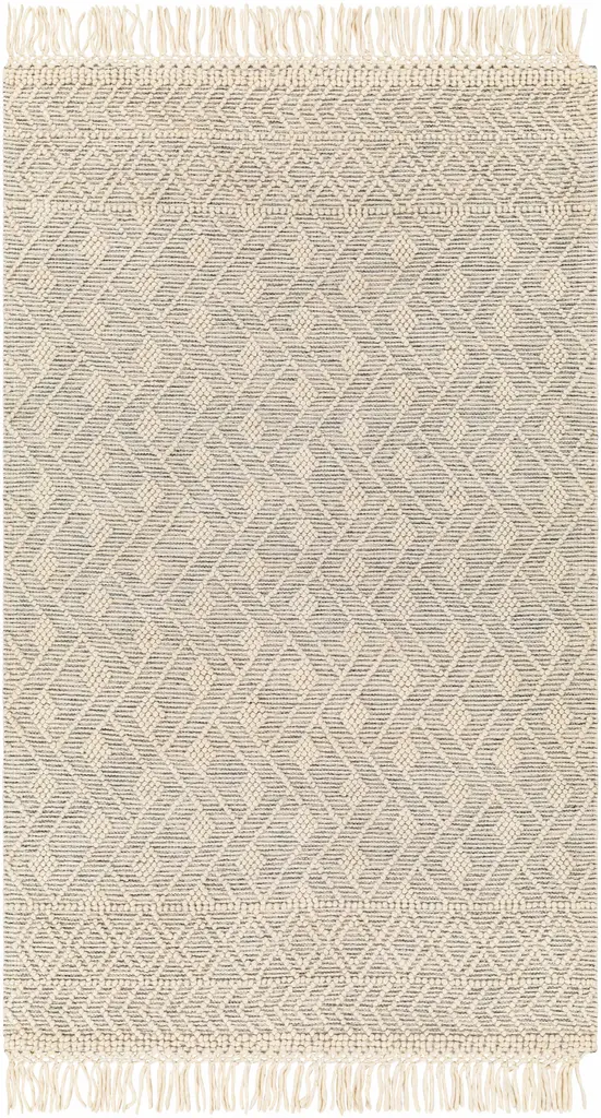 Collection: Erica Colors: Ivory, Black Construction: Hand Woven Material: 60% Wool,40% Polyester Pile: No Pile Styles: Transitional,Traditional Made In: India Thickness: 0.51" Fringe Length: 4" Price Range: $$$$$ (Most Affordable)