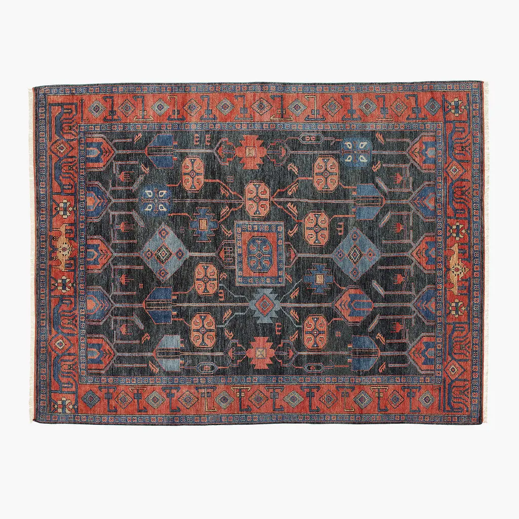 Persian-inspired rug has some of the densest hand-knotting we've ever done. The more knots, the more intricate the design and the stronger the weave. This traditional pattern in rich tones of blues, reds and pinks is made entirely by hand. CB2 exclusive.How will it look in your room? 12"x12" rug samples are available in stores for a fee refundable upon return of the sample.