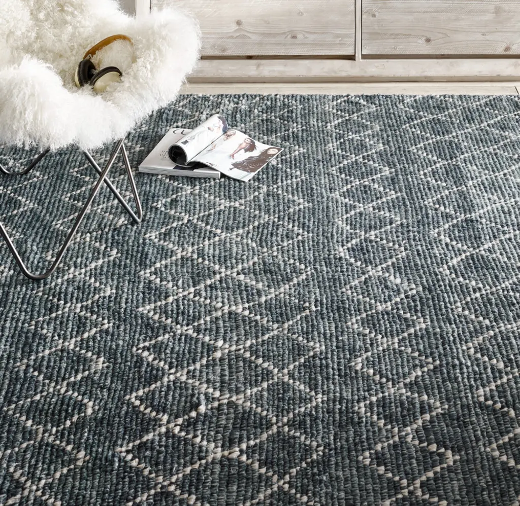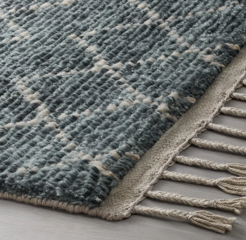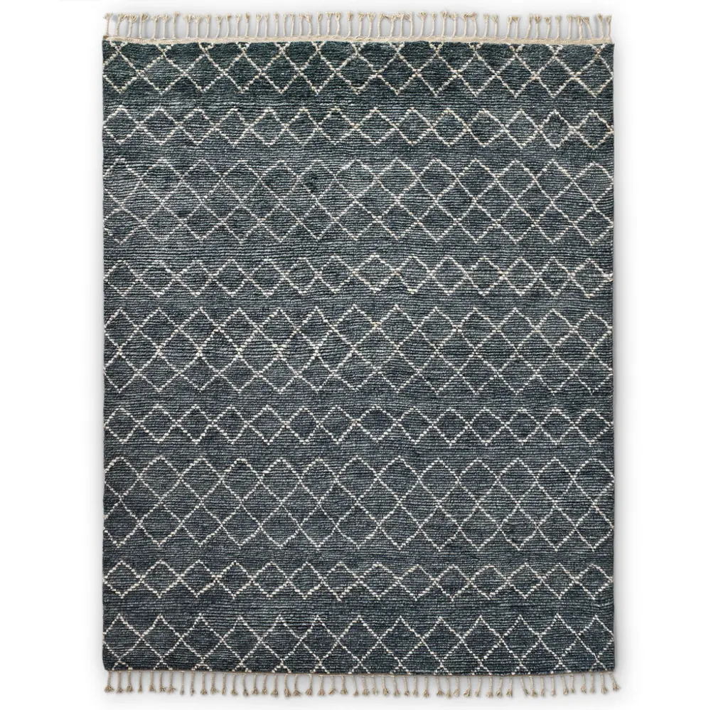 Hand knotted from thick wool yarns and hand sheared to a medium pile, our Escala rug offers shaggy softness with a diamond pattern and chunky, ribbed lines. Overdyed with natural tints, the wool's natural shading creates a richly striated effect.