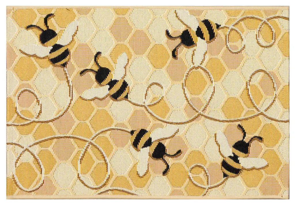 Busy black and yellow bees buzzing around on a multi shade gold mosaic background. Made in Egypt from 75% polypropylene/25% polyester, reinforced with a latex non-skid backing, the Esencia Collection is Power Loomed to create intricate designs with a broad color spectrum and a high-quality finish. The material is flatwoven, low profile, weather resistant, UV stabilized for enhanced fade resistance, durable and ideal for those high traffic areas such as your patio, sunroom, kitchen, entryway, hallway, living room and bedroom making this the ideal indoor or outdoor rug. Detailed patterns are offered in an eclectic mix of styles ranging from tropical, coastal, geometric, contemporary and traditional designs; making these perfect accent rugs for your home. Limiting exposure to rain, moisture and direct sun will prolong rug life.