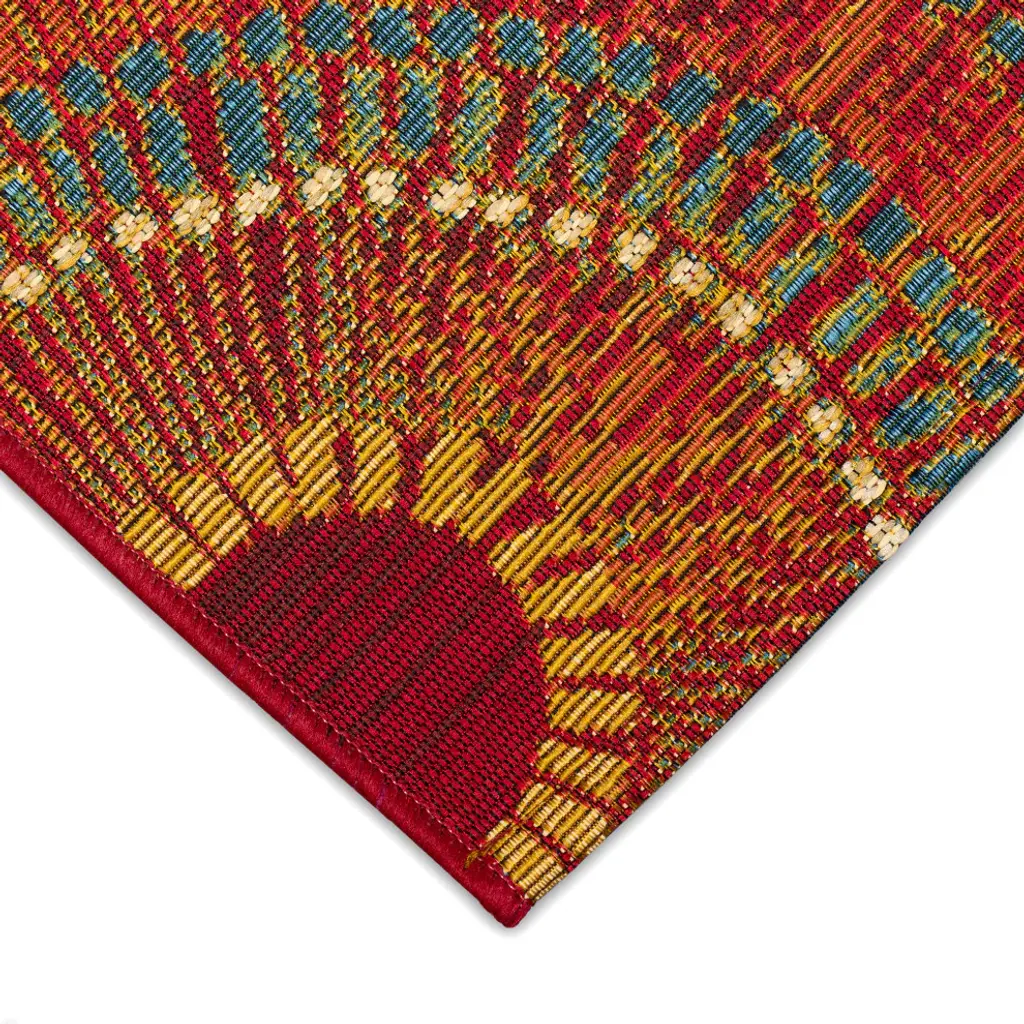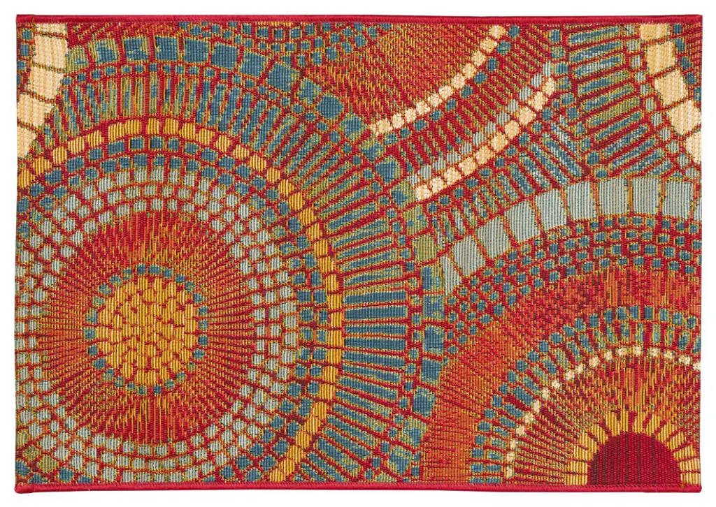 Add a sophistically playful touch to your space with these overlapping multicolored red, white, blue and yellow circles. The design is enhanced with the mosaic like effect created from the dots, lines and squares that join to create each larger circular shape. Bold in color, this stunning design is an effortless way to add style to your home. Made in Egypt from 75% polypropylene/25% polyester, reinforced with a latex non-skid backing, the Esencia Collection is Power Loomed to create intricate designs with a broad color spectrum and a high-quality finish. The material is flatwoven, low profile, weather resistant, UV stabilized for enhanced fade resistance, and durable. Ideal for those high traffic areas such as your patio, sunroom, kitchen, entryway, hallway, living room and bedroom making this the ideal indoor or outdoor rug. Detailed patterns are offered in an eclectic mix of styles ranging from tropical, coastal, geometric, contemporary and traditional designs; making these perfect accent rugs for your home. Limiting exposure to rain, moisture and direct sun will prolong rug life.