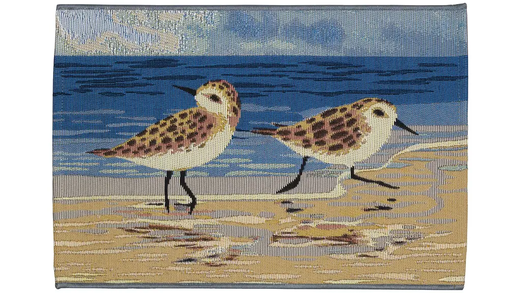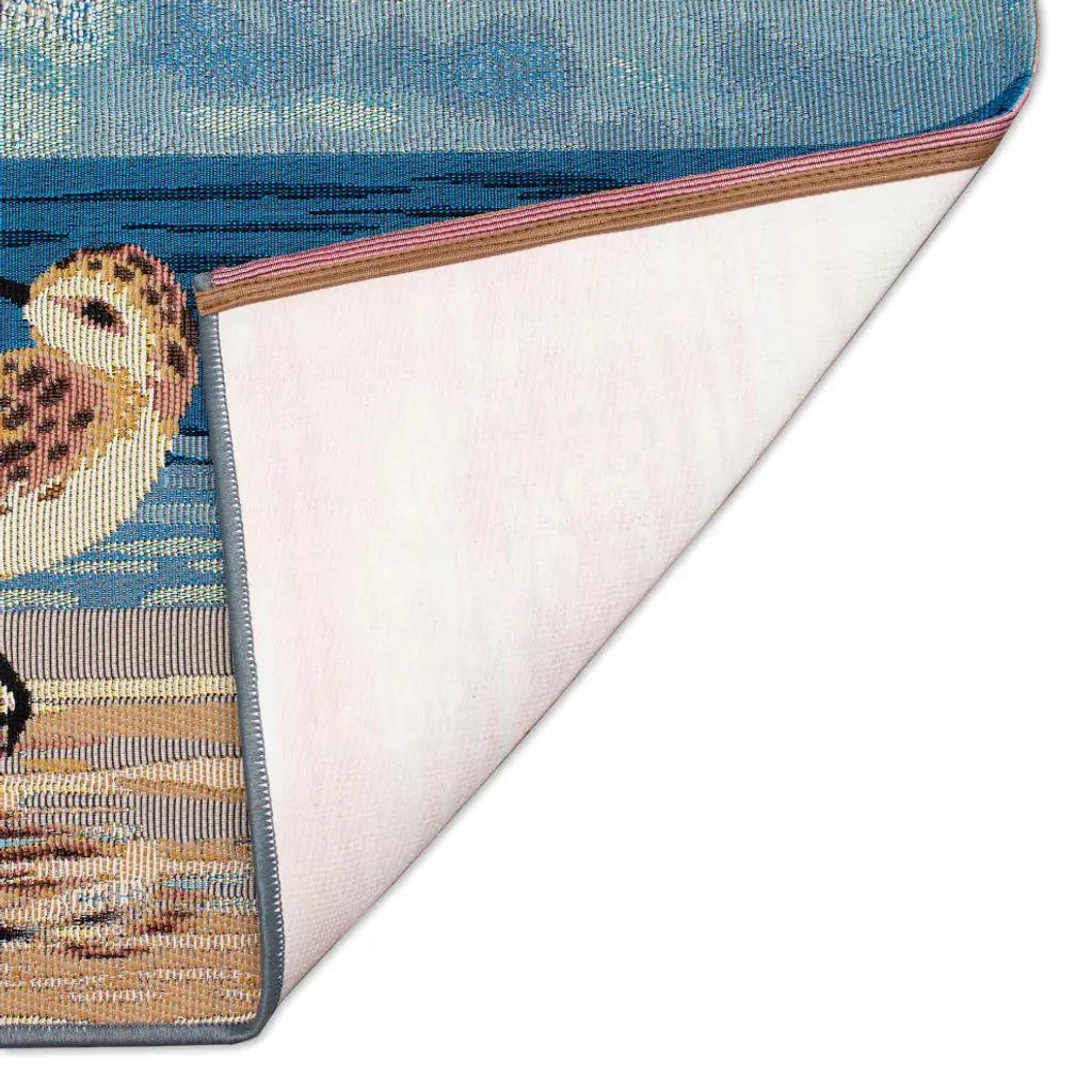 Featuring cute little sandpipers strolling along the sandy beach with an ocean blue background. This beachy coastal design will effortlessly complement any space inside or outside your home. Made in Egypt from 75% polypropylene/25% polyester, reinforced with a latex non-skid backing, the Esencia Collection is Power Loomed to create intricate designs with a broad color spectrum and a high-quality finish. The material is flatwoven, low profile, weather resistant, UV stabilized for enhanced fade resistance, durable and ideal for those high traffic areas such as your patio, sunroom, kitchen, entryway, hallway, living room and bedroom making this the ideal indoor or outdoor rug. Detailed patterns are offered in an eclectic mix of styles ranging from tropical, coastal, geometric, contemporary and traditional designs; making these perfect accent rugs for your home. Limiting exposure to rain, moisture and direct sun will prolong rug life.