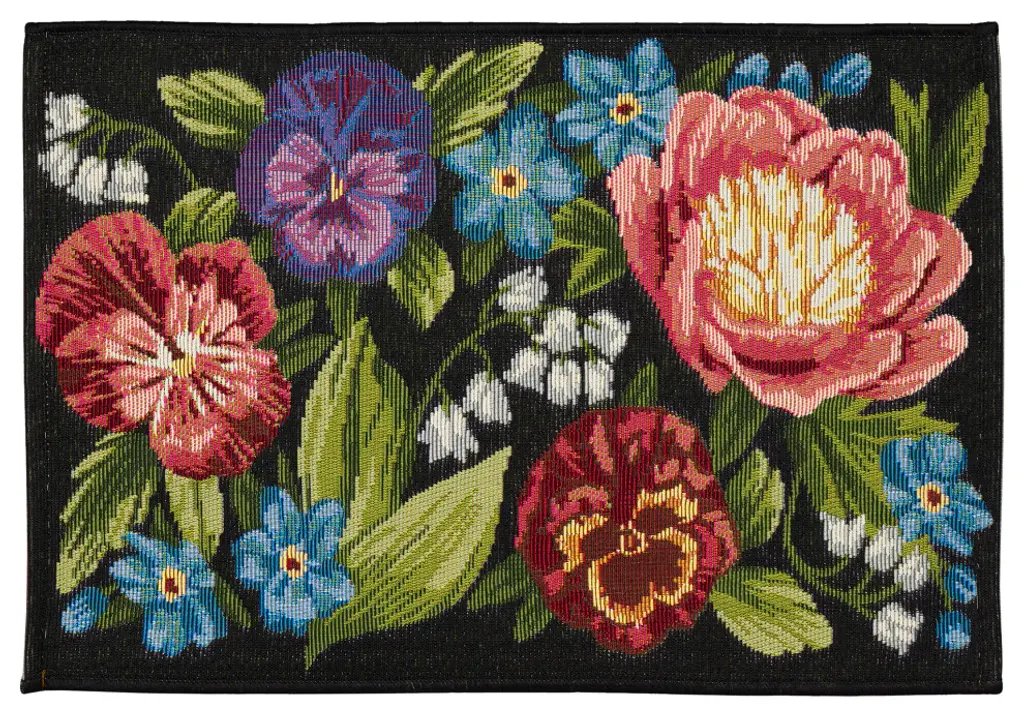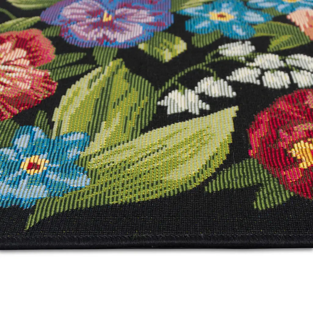 This cheerful garden mat of fully blooming flowers will brighten everyone''s day as they enter your home, in black. Made in Egypt from 75% polypropylene/25% polyester, reinforced with a latex non-skid backing, the Esencia Collection is Power Loomed to create intricate designs with a broad color spectrum and a high-quality finish. The material is flatwoven, low profile, weather resistant, UV stabilized for enhanced fade resistance, durable and ideal for those high traffic areas such as your patio, sunroom, kitchen, entryway, hallway, living room and bedroom making this the ideal indoor or outdoor rug. Detailed patterns are offered in an eclectic mix of styles ranging from tropical, coastal, geometric, contemporary and traditional designs; making these perfect accent rugs for your home. Limiting exposure to rain, moisture and direct sun will prolong rug life.