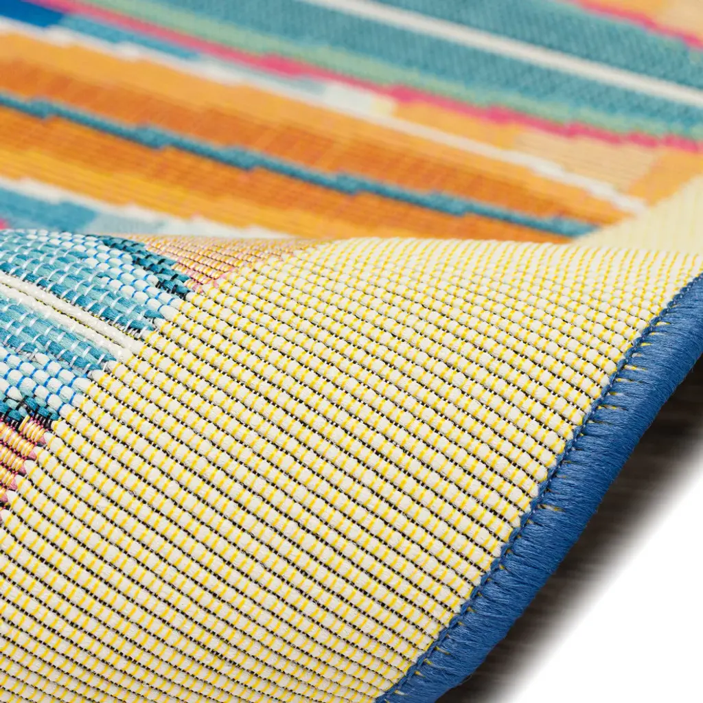 Add a fun and coastal vibe to your doorstep with this mat featuring colorful surfboards against an ocean blue background on a sandy beach. Made in Egypt from 75% polypropylene/25% polyester, reinforced with a latex non-skid backing, the Esencia Collection is Power Loomed to create intricate designs with a broad color spectrum and a high-quality finish. The material is flatwoven, low profile, weather resistant, UV stabilized for enhanced fade resistance, durable and ideal for those high traffic areas such as your patio, sunroom, kitchen, entryway, hallway, living room and bedroom making this the ideal indoor or outdoor rug. Detailed patterns are offered in an eclectic mix of styles ranging from tropical, coastal, geometric, contemporary and traditional designs; making these perfect accent rugs for your home. Limiting exposure to rain, moisture and direct sun will prolong rug life.