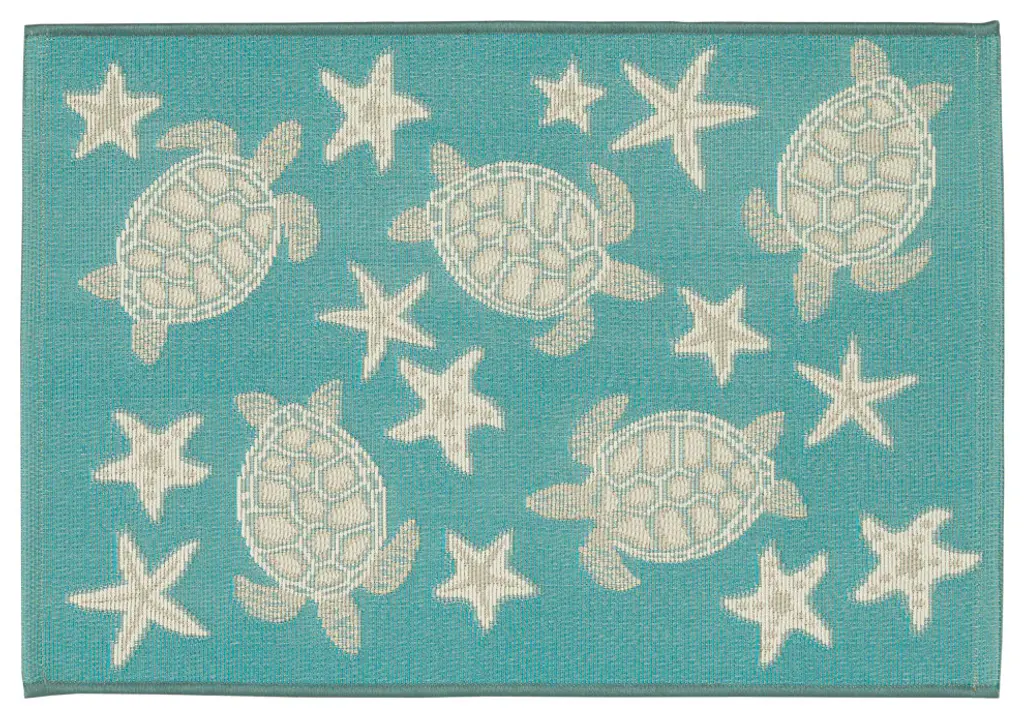 A coastal inspired mat featuring a vibrant aqua-blue background with swimming ivory turtles and starfish. This classic subtle tropical design will effortlessly complement any space inside or outside your home. Made in Egypt from 75% polypropylene/25% polyester, reinforced with a latex non-skid backing, the Esencia Collection is Power Loomed to create intricate designs with a broad color spectrum and a high-quality finish. The material is flatwoven, low profile, weather resistant, UV stabilized for enhanced fade resistance, durable and ideal for those high traffic areas such as your patio, sunroom, kitchen, entryway, hallway, living room and bedroom making this the ideal indoor or outdoor rug. Detailed patterns are offered in an eclectic mix of styles ranging from tropical, coastal, geometric, contemporary and traditional designs; making these perfect accent rugs for your home. Limiting exposure to rain, moisture and direct sun will prolong rug life.