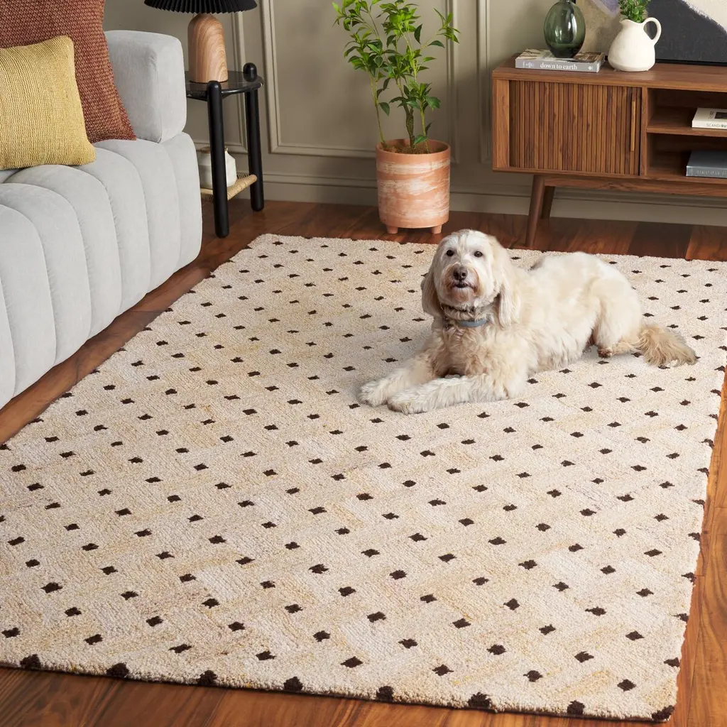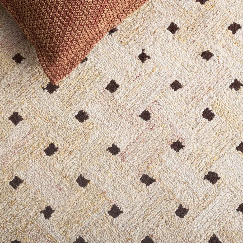Introducing our exquisite 3' X 5' Hand-tufted Modern Area Rug, a seamless blend of elegance and durability that will enhance any room. Crafted with meticulous attention to detail, this small rectangle rug from India boasts a sophisticated light brown and ivory color palette infusing warmth and versatility into your living space. Our modern-style rug showcases a striking pattern, featuring a harmonious spread of dark accents across a serene light brown backdrop, creating a captivating diamond-like motif that's sure to draw the eye and anchor your decor. Constructed with a premium mix of materials including 55% Wool for plushness, 10% Viscose for a silky sheen, 25% Nylon for enhanced durability, and 10% Cotton for a soft touch ? this hand-tufted marvel offers both comfort and longevity. The resilient blend ensures that the rug maintains its shape and structure even in high-traffic areas, making it a perfect choice for your living room, bedroom, or study. Celebrate the fusion of traditional craftsmanship and modern design with our beautiful area rug, a timeless piece that promises to transform your home. Indulge in the luxurious feel and contemporary charm of this magnificent addition to your floors.
